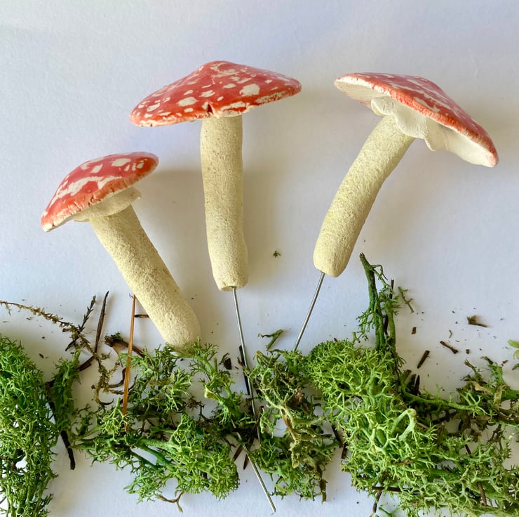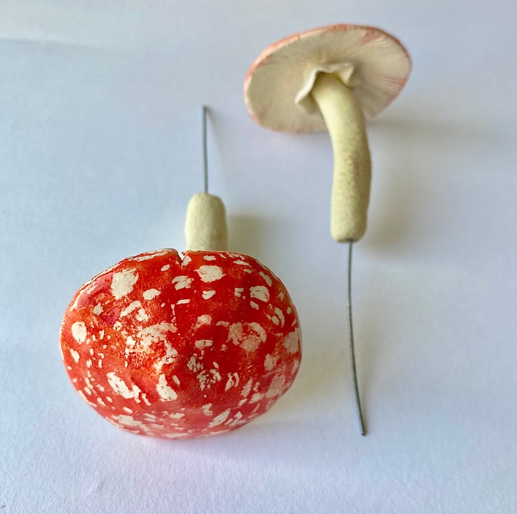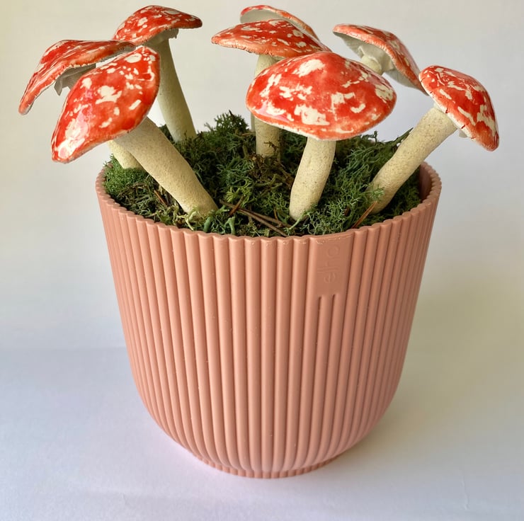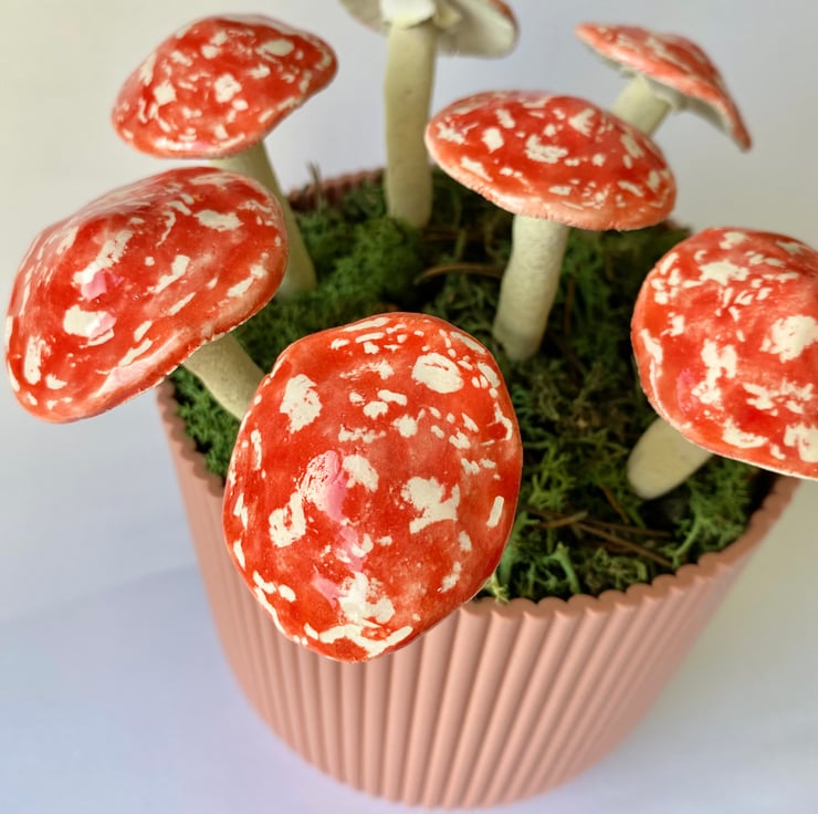 These ceramic mushroom plant pot ornaments are made using two types of clay, hand building clay for the top and craft crank for the stem of the mushroom. They are hand painted with a white and red underglaze and finished off with transparent crystal glaze for the top and a straw underglaze for the stem.