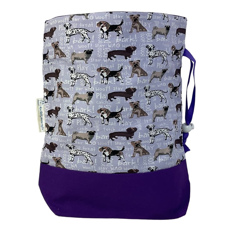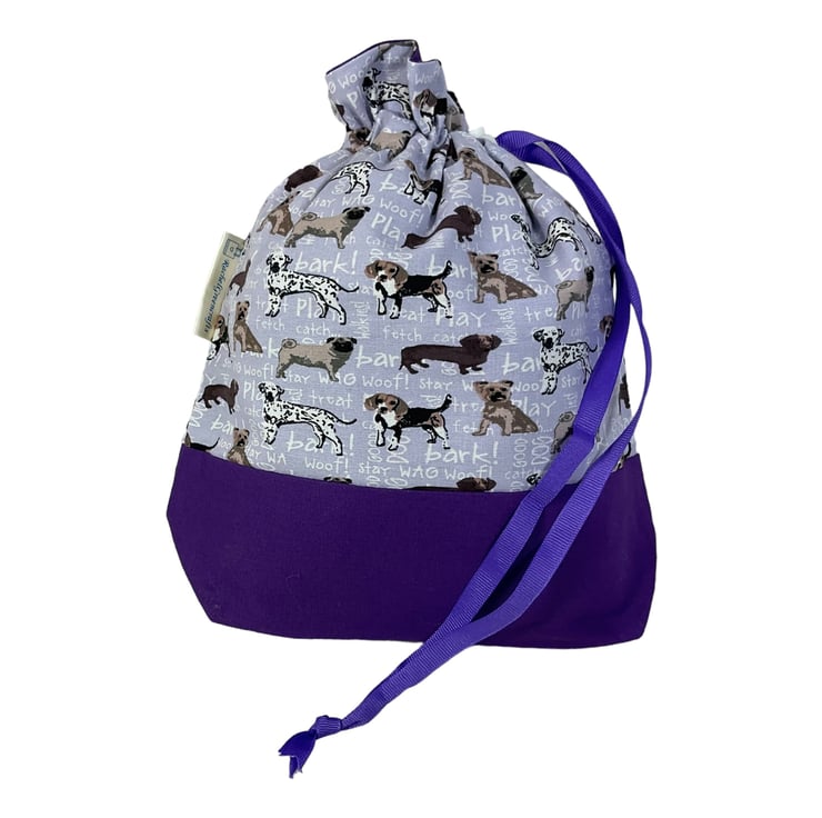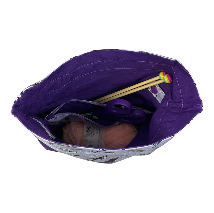 This is a two at a time knitting bag, but it also could be used for other things. It has the cutest dog breed print cotton on a lilac background and I have paired it with a bright deep purple lining and exterior accent piece. The divider inside the bag is a fixed zip pouch that has the exterior and lining matching as the main bag itself. Inside are 2 fabric matched yarn guides, fastened with snaps. The lower portion of the bag is interfaced and boxed so it stands up.
