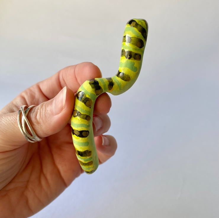 These ceramic caterpillar plant pot friends are hand painted with green underglaze and then decorated with black and yellow underglaze. They are then finished off with transparent crystal glaze to highlight the colours of the caterpillar.