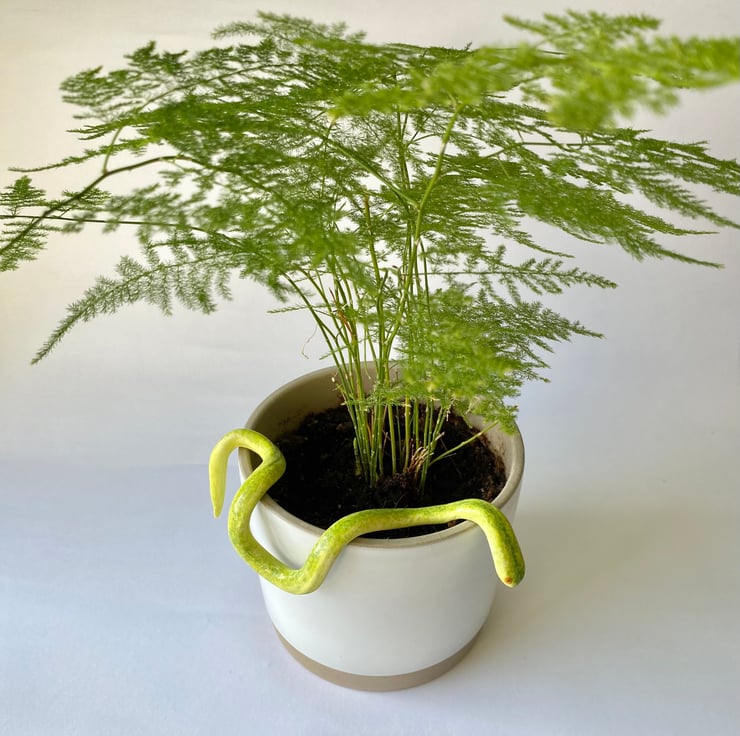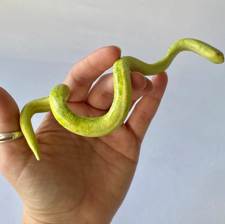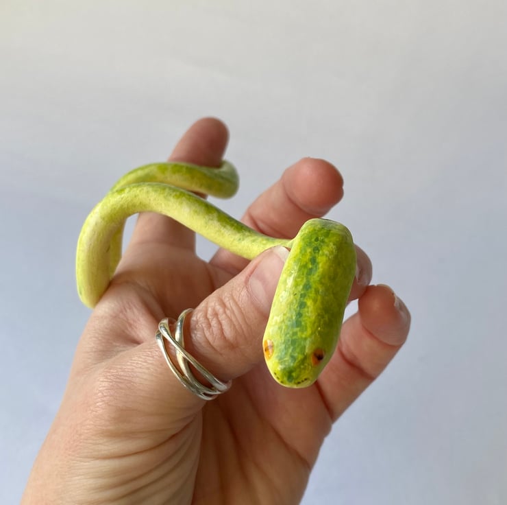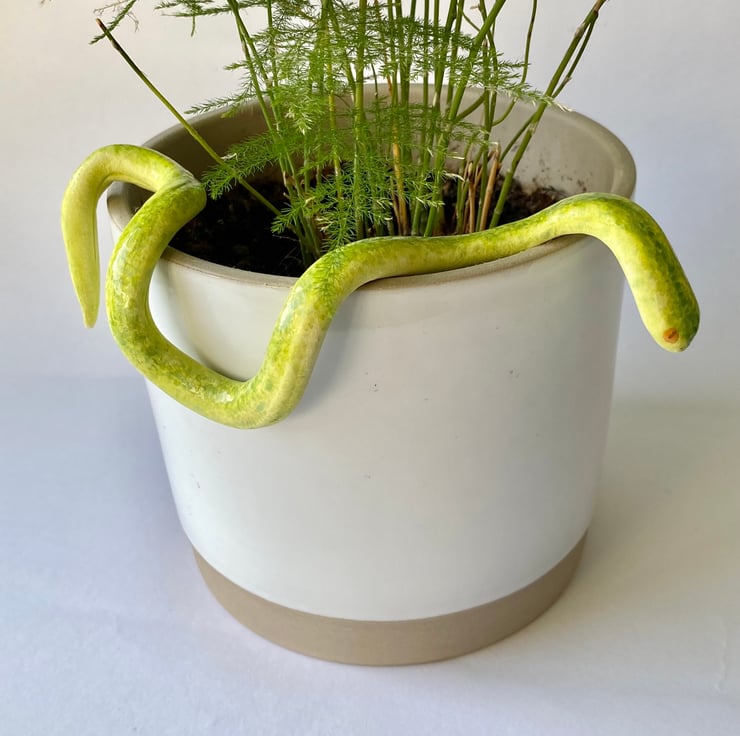 This ceramic snake plant pot friend is hand painted with green underglaze and then decorated with darker green detail and golden yellow eyes. They are then finished off with transparent crystal glaze to highlight the scales on the snake.