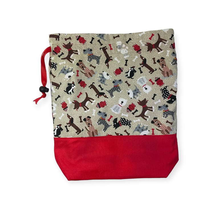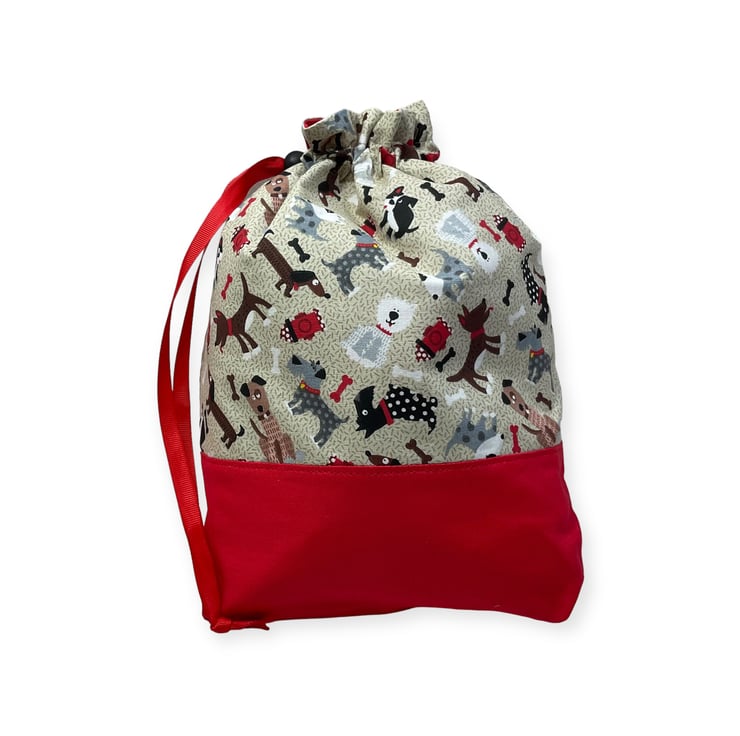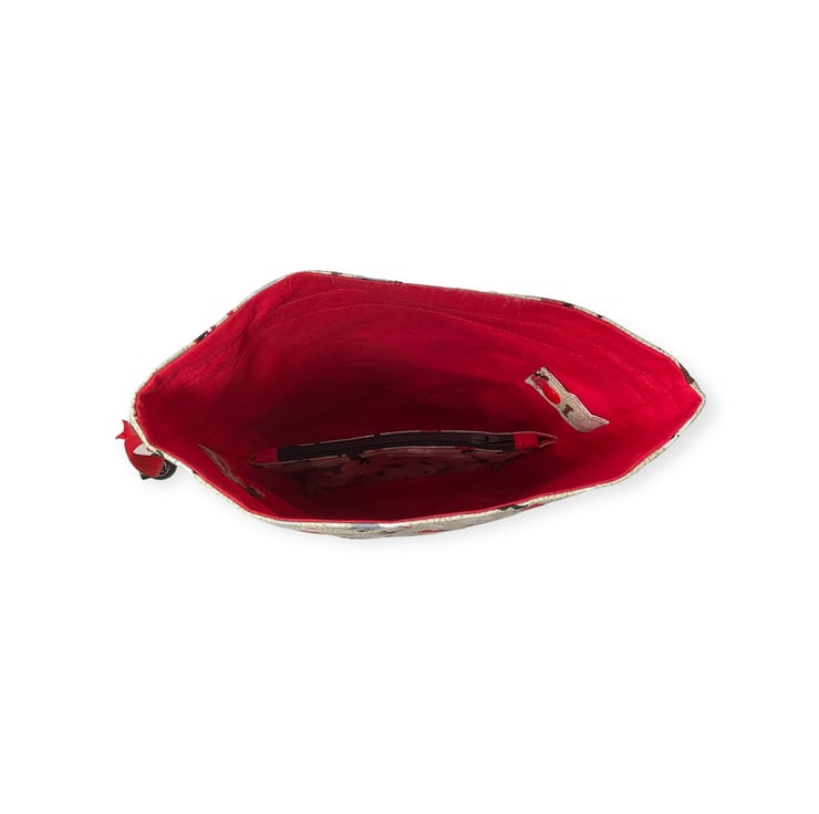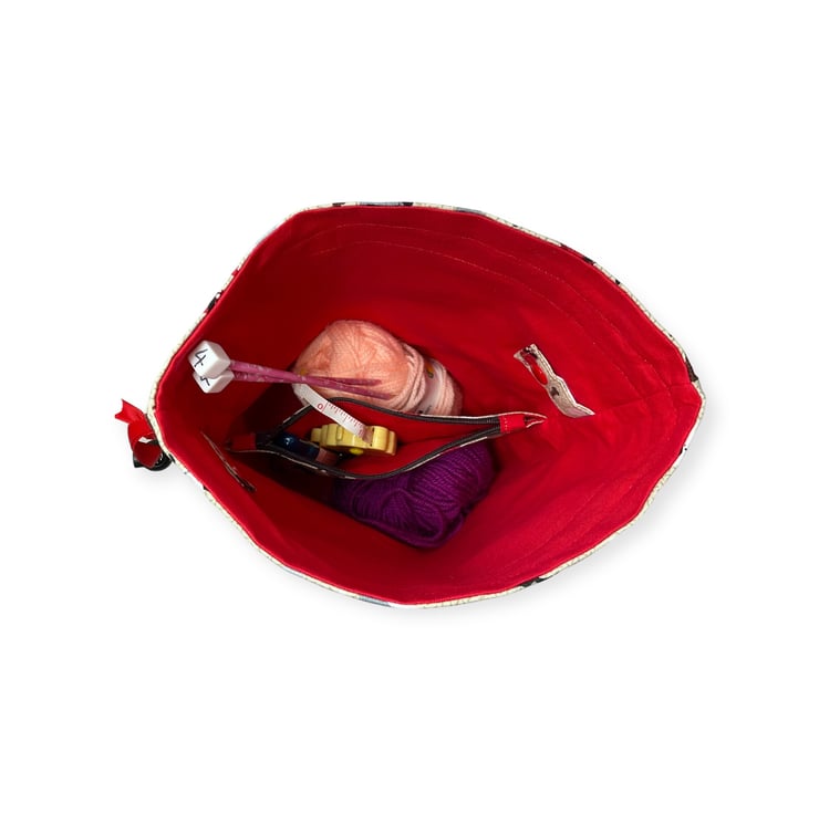 This is a two at a time knitting bag, but it also could be used for other things. It has the cutest cats in lines print cotton on a white background and I have paired it with a bright red with black spot lining and exterior accent piece. The divider inside the bag is a fixed zip pouch that has the exterior and lining matching as the main bag itself. Inside are 2 fabric matched yarn guides, fastened with snaps. The entire bag is interfaced and the base boxed so it stands up.