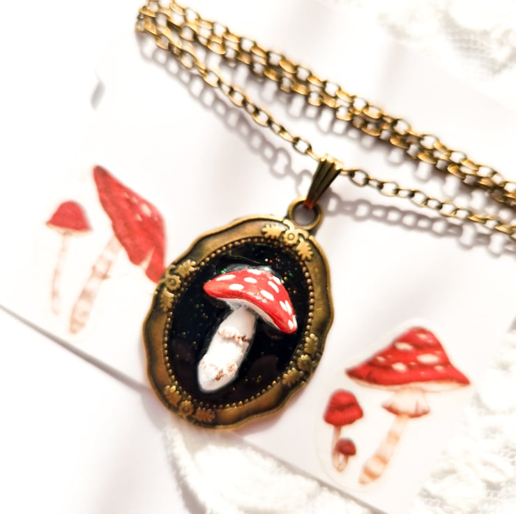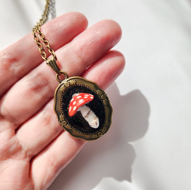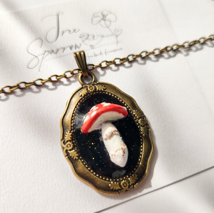 A tiny 3D mushroom pendant handmade from clay. Each piece is carefully sculpted and glazed by hand, perfect for nature lovers and those who adore whimsical woodland charm.