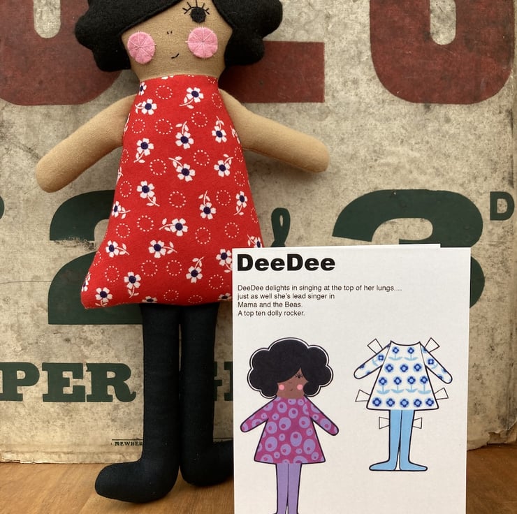I hand painted DeeDee and her extra dress on paper with acrylic paint. I then scanned her and formatted her with text in the computer before sending her off to be professionally printed on thick 350gsm card with a satin coating.