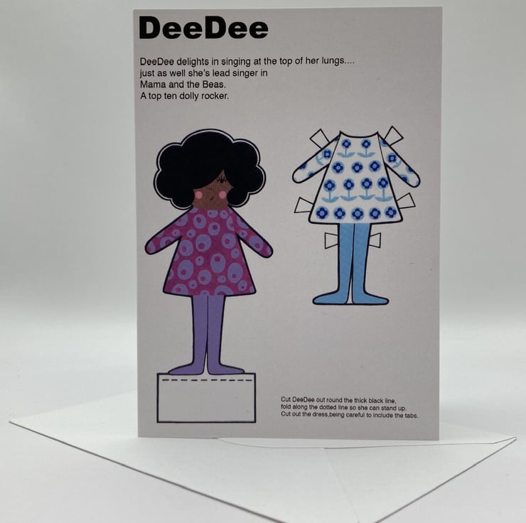 DeeDee is not only a cloth doll she is also available as a paper doll blank greetings card.