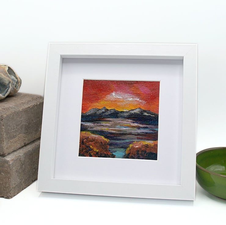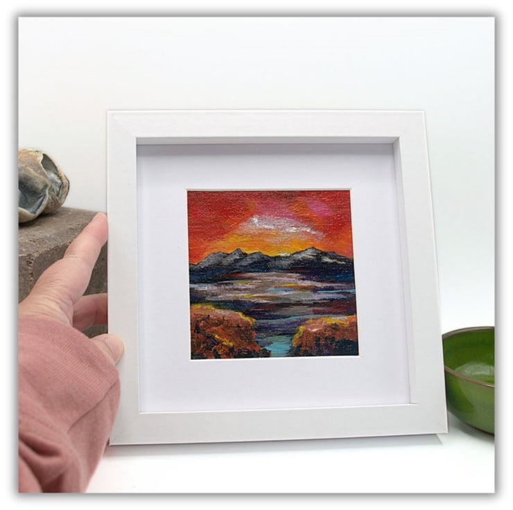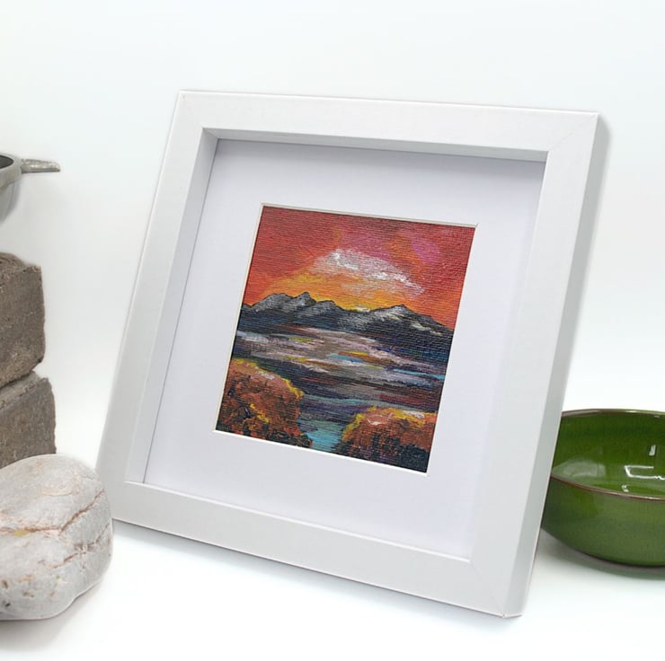 This framed Scottish landscape with a brilliant red sky, will be posted out by first class Royal Mail. The painting will be carefully encased in bubble wrap (or equivalent). It will then be secured in a heavy duty mailing box.