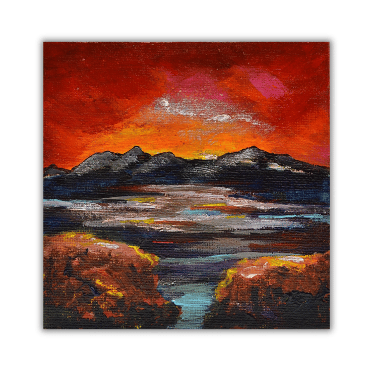 This is a framed acrylic painting. Being at the coast and seeing a red sky, can give us a sense of joy and wellbeing. The night sky is reflected in the sea which intensifies that joy. I have used the smallest paintbrush I own to flick thick layers of paint over the canvas to depict the movement of the water and the heat radiating from the land.