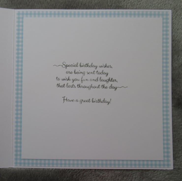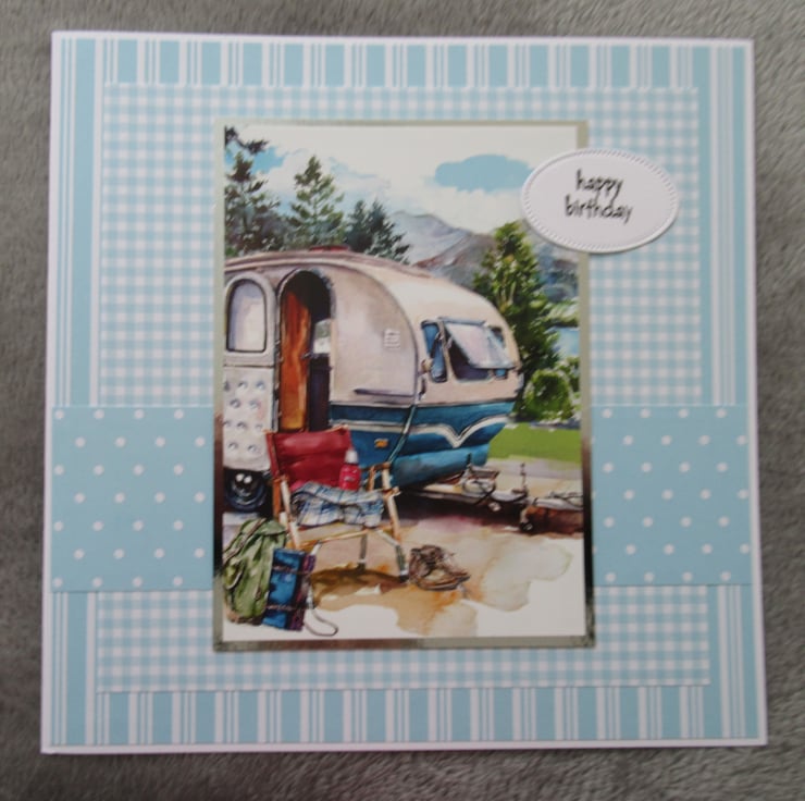 A lovely card in a duck egg blue colour way using quality card and papers. The image of an old style caravan is approx A6 in size and has a silver mat behind it. I have used decorative papers similiar to those used in the image itself for the background and stamped a Happy Birthday greeting to finish of the card. The inside has been finished to coordinate with a stamped verse as pictured.