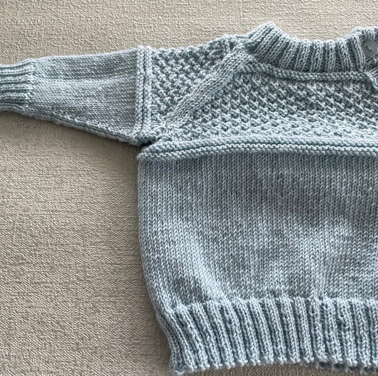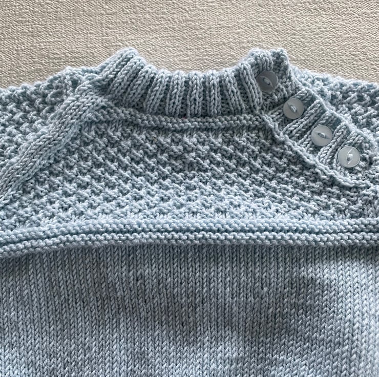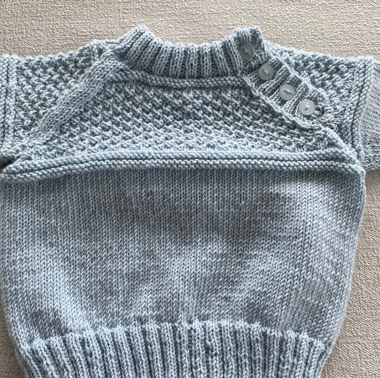 This hand knitted jumper is worked in a soft, blue merino wool.