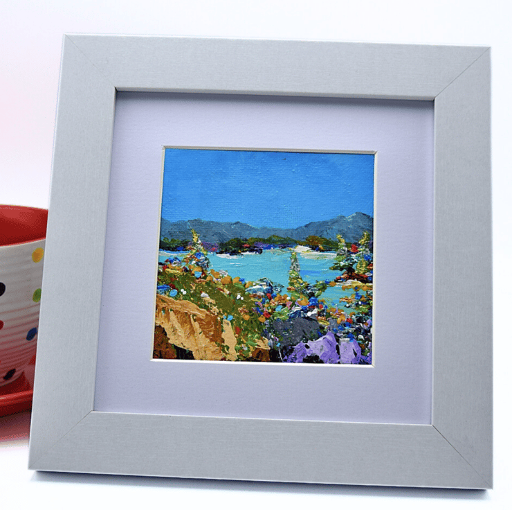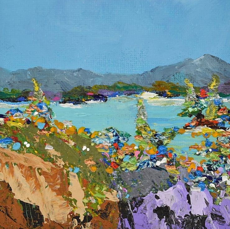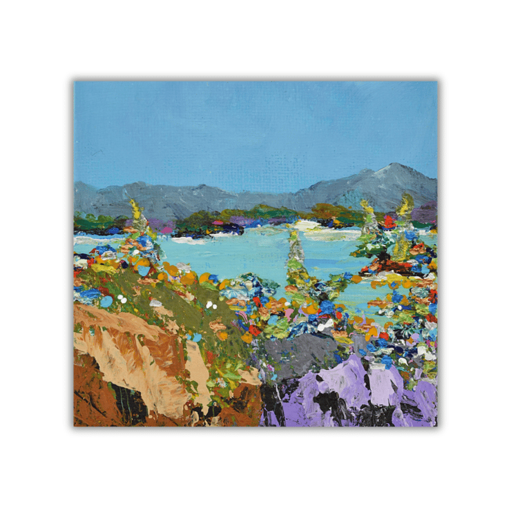There is so much to see in this bright, colourful, acrylic painting. The blue of the sky cloaks the Ben Lawers mountain range in the far distance. Loch Tay rolls along looking calm and inviting. In the foreground we see the hints of trees, foliage, rocks, boulders and flowers that provide shelter to wildlife.