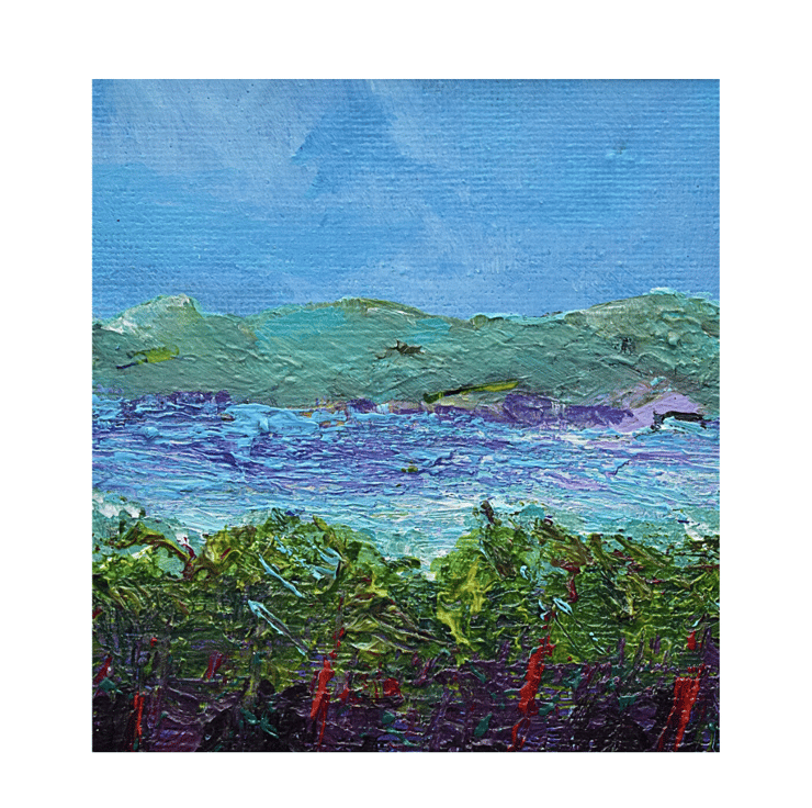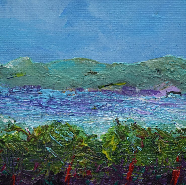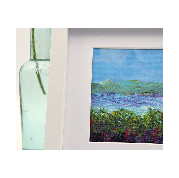 This is a framed acrylic landscape. The freezing, cold water of Loch Ness runs through the middle of this small landscape painting, almost mirroring the crisp, blue sky above. I’ve used a very small brush and with quick, flicks and swirls, I have layered the acrylic paint on thick and fast to help depict the choppy waters. The treetops in the foreground and hills to the back, cradle the Loch as it cuts through the heart of the Great Glen.
