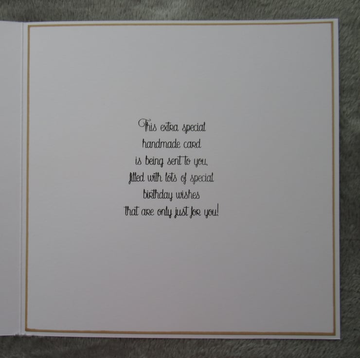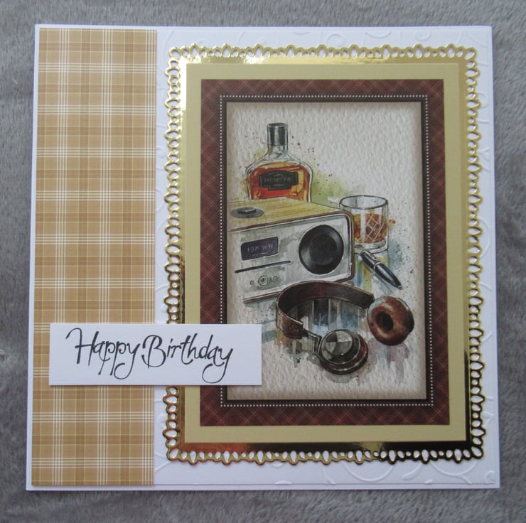A lovely card in beige and brown tones using quality card and papers. The image of a radio, headphones and an alcoholic beverage is approx A6 in size and has beige and gold mats behind it. I have used decorative card to place a border down one side and embossed the white background card for added texture. I then stamped and added a Happy Birthday greeting to the card and finished the inside to coordinate with a stamped verse as pictured.
