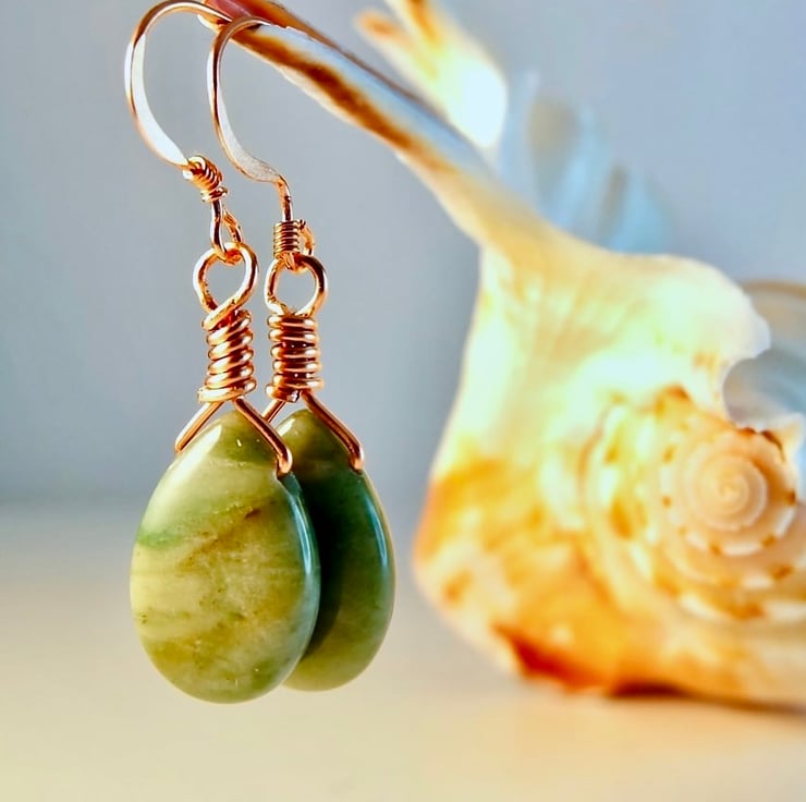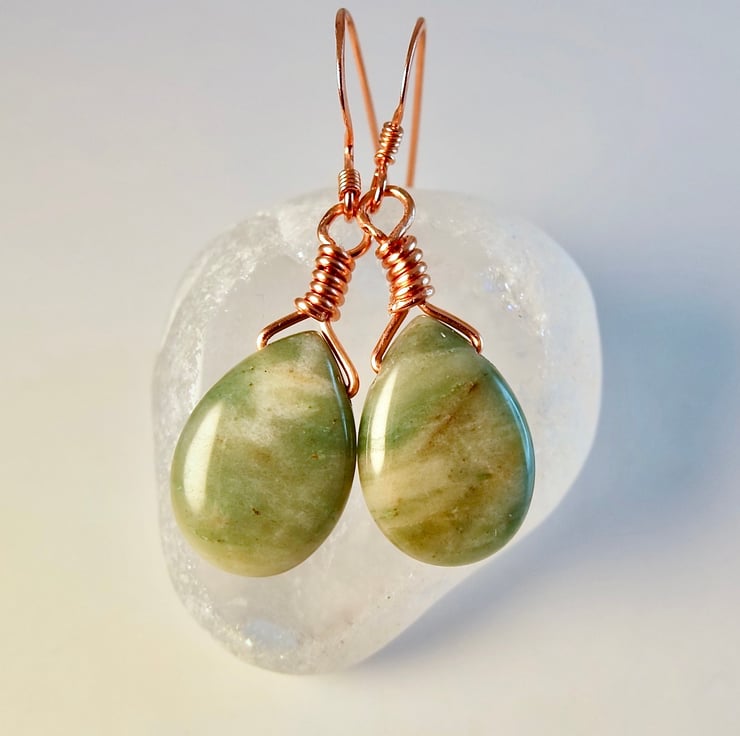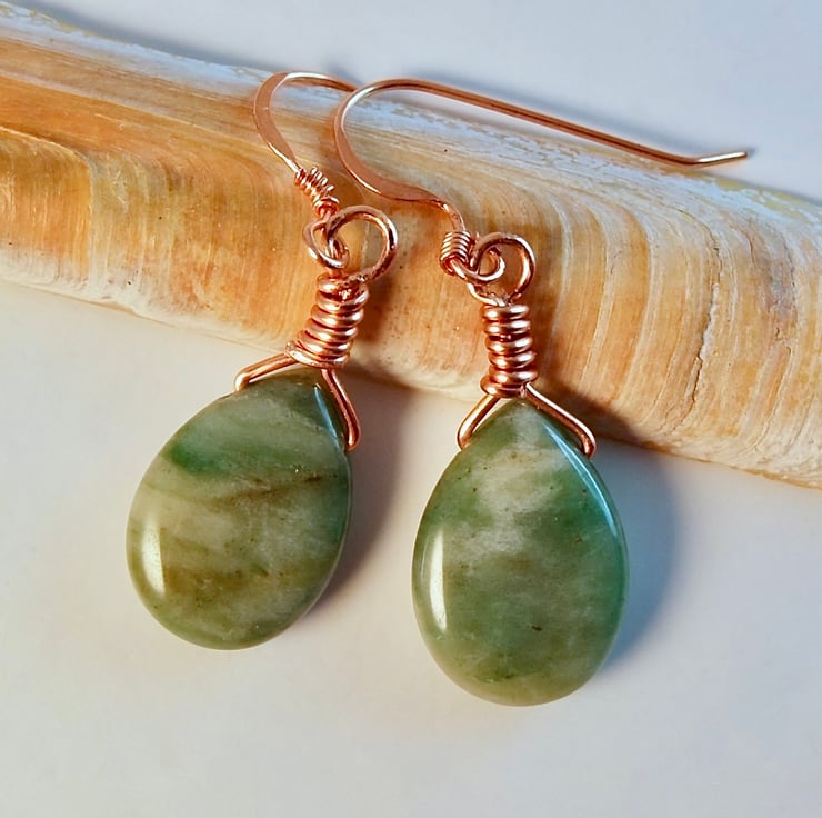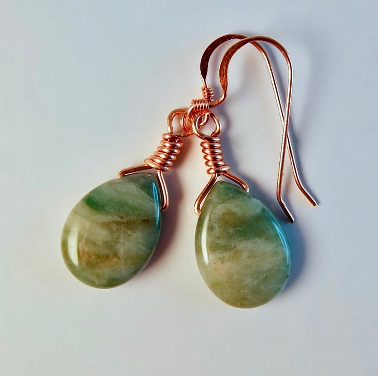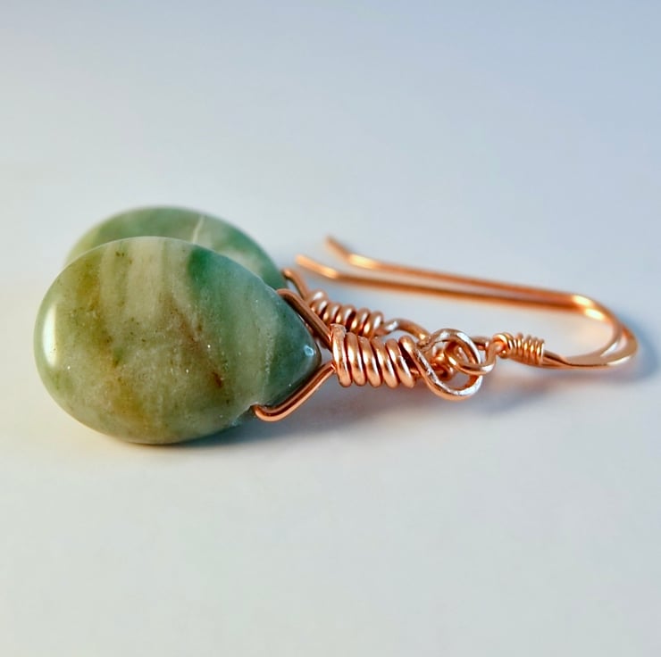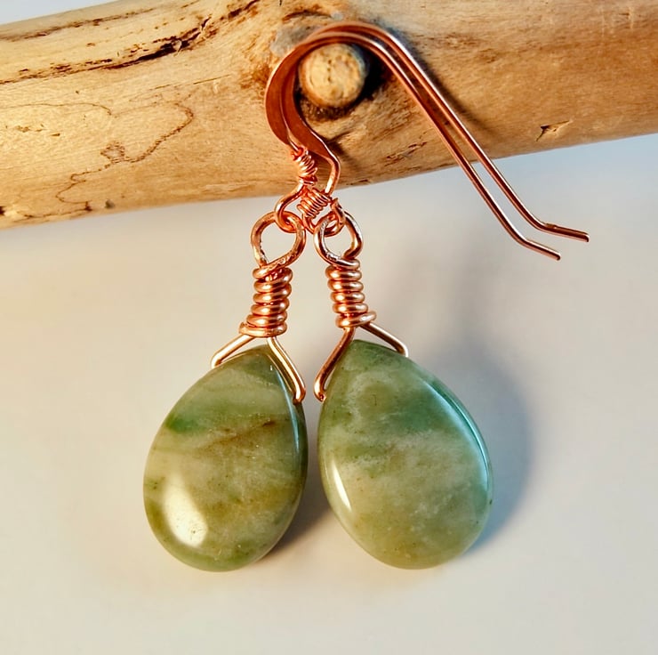 Pretty green teardrop Tree Agate earrings with copper wires.