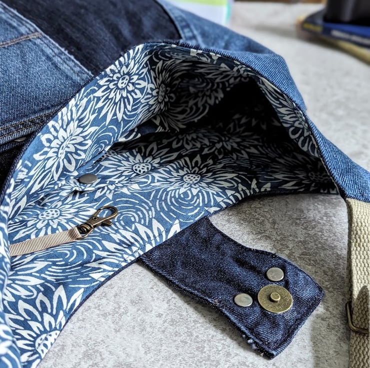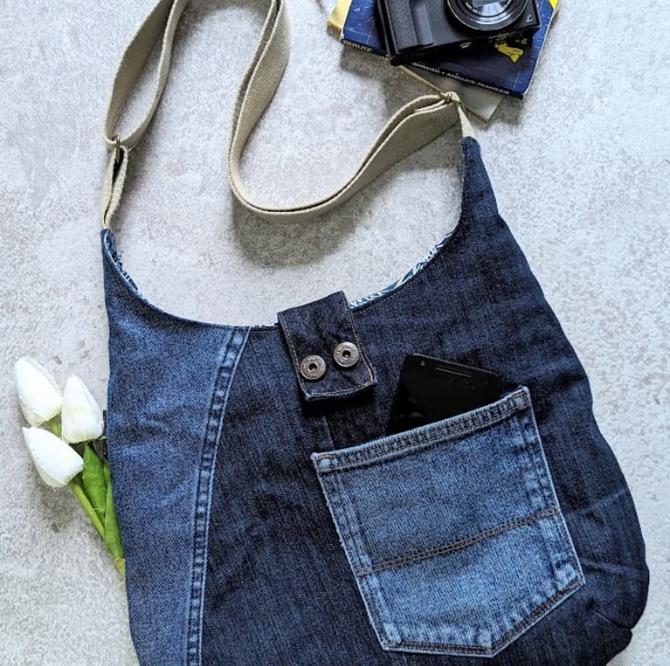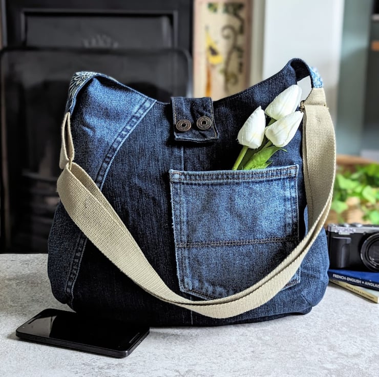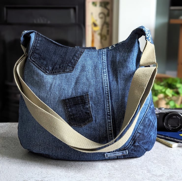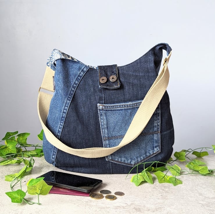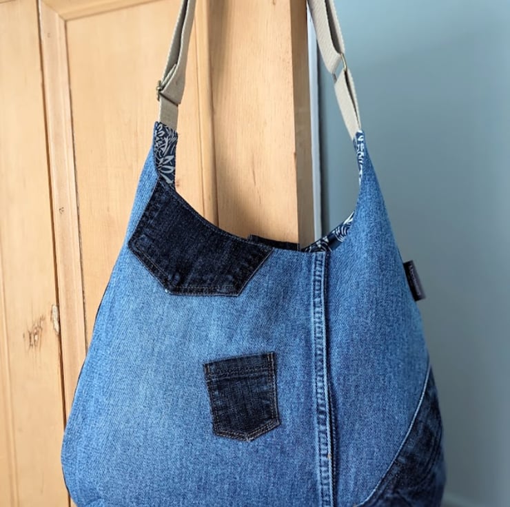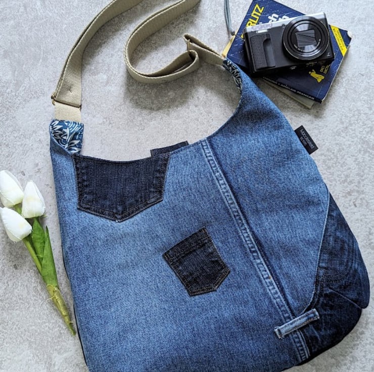 This patchwork denim shoulder or cross body bag has been made using pieces of denim reducing waste from my other designs.