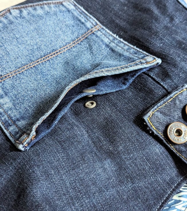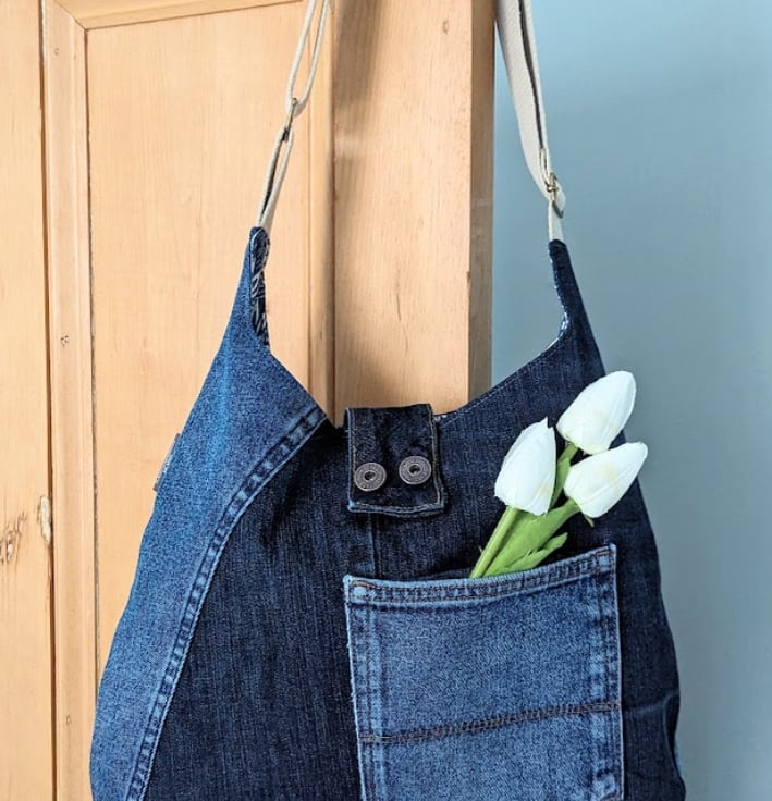 The front of the bag has a jeans pocket with a hidden plastic snap fastening and a section of jeans waistband as a closure.