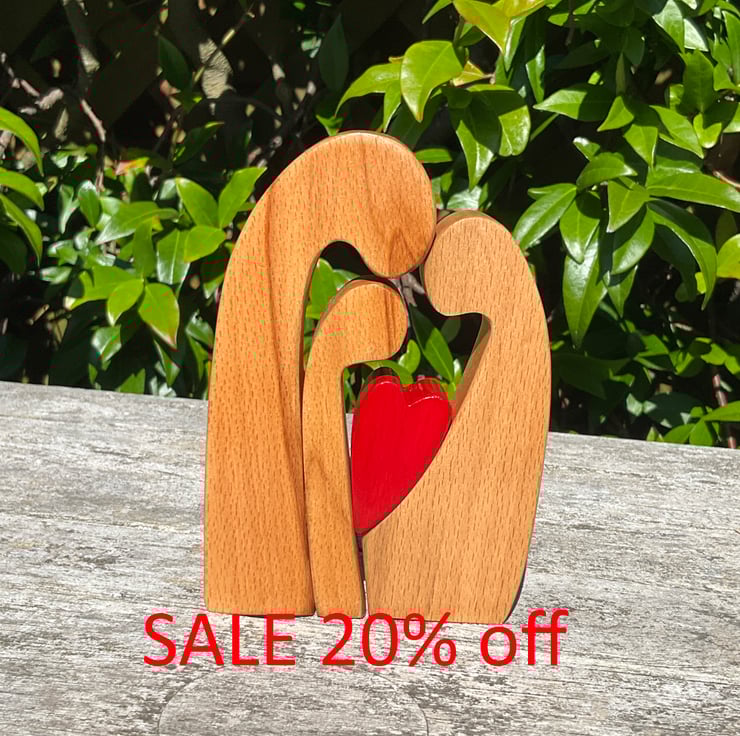 Love is the centre of any family, symbolised by a central heart between stylised figures of two adults and child. The figures can stand upright with the loose heart supported between them. The arrangement is made of beech wood which has been sanded to provide a very tactile finish free of rough or sharp edges. The natural appearance of beech wood is further enhanced by multiple coats of drying oil giving a light golden brown colouration and a deep satin sheen. The heart is coated with non toxic paint.