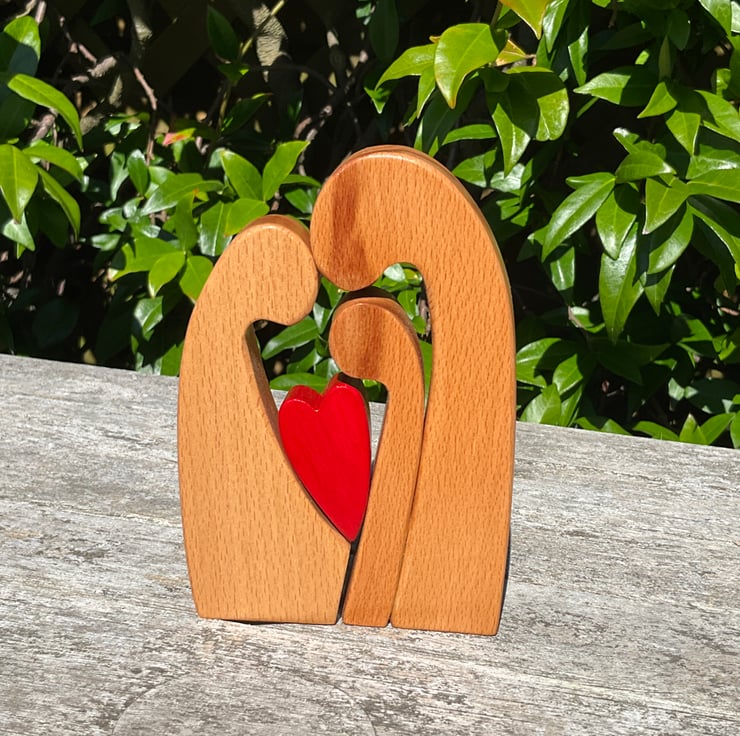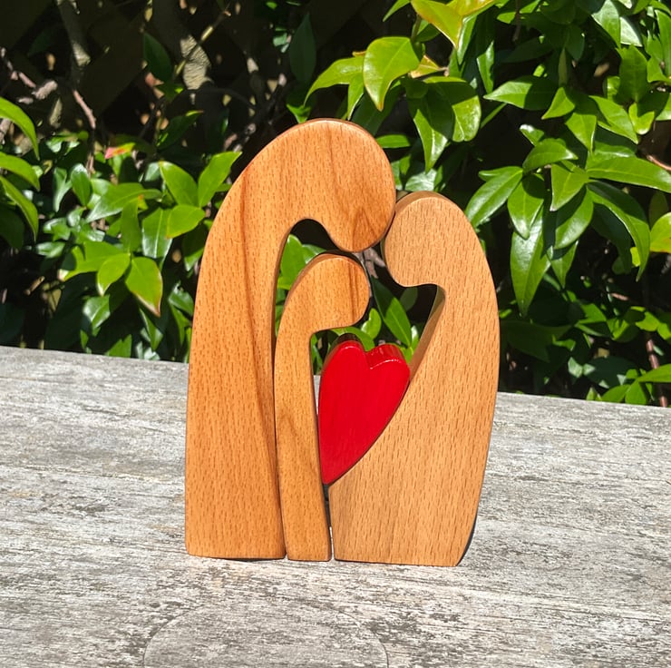 Love is the centre of any family, symbolised by a central heart between stylised figures of two adults and child. The figures can stand upright with the loose heart supported between them. The arrangement is made of beech wood which has been sanded to provide a very tactile finish free of rough or sharp edges. The natural appearance of beech wood is further enhanced by multiple coats of drying oil giving a light golden brown colouration and a deep satin sheen. The heart is coated with non toxic paint.
