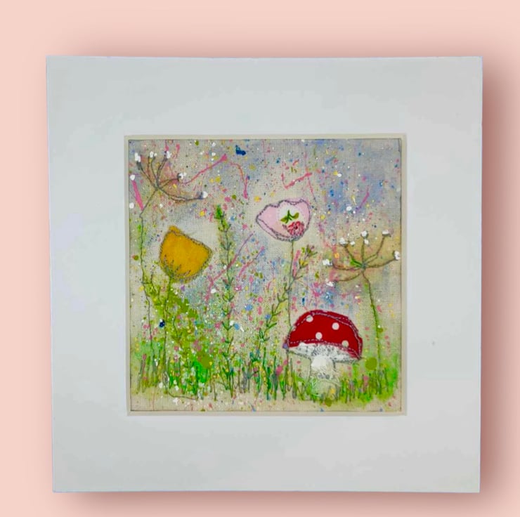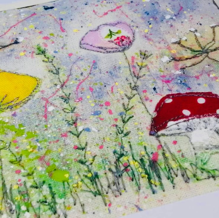 I have used techniques including..free motion embroidery..appliqué..Derwent inktense pencils & acrylic paint..to create this whimsical wildflower meadow scene.