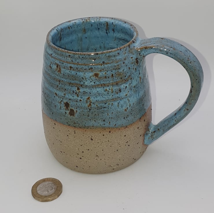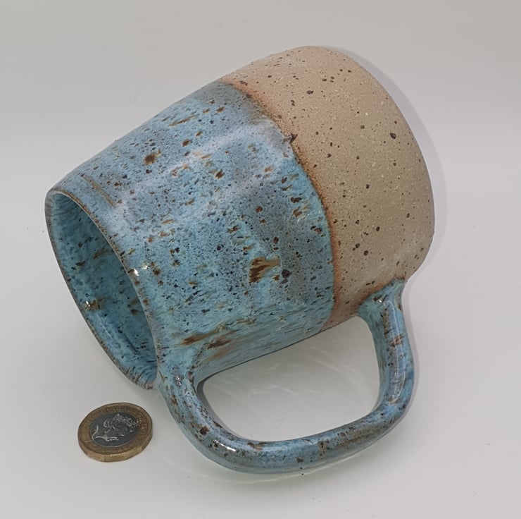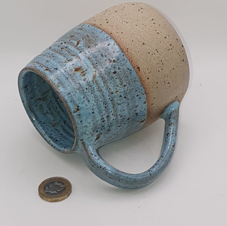 Gorgeous mugs made with speckled clay. Wheel thrown. Half glazed in a speckled blue glaze leaving the wonderful toasty speckled glaze visible. Nice!