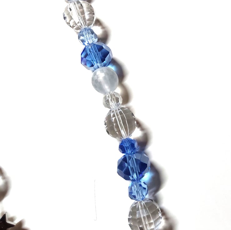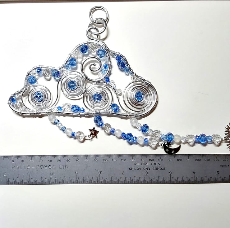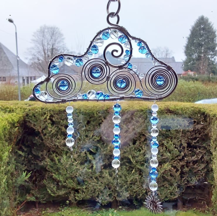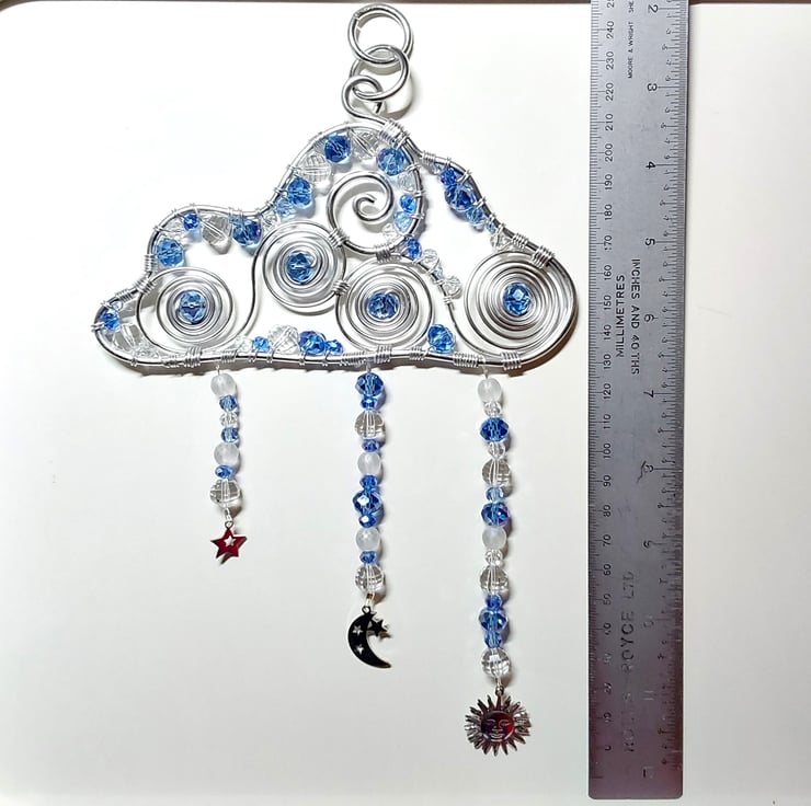 I made this cloud with a thick aluminium frame and other thicknesses of wire for the spiral designs and the wrapping of the beads. The beads are a mixture of glass faceted beads, round geometric patterned frosted beads and clear crystal faceted beads. The charms that hang from the rain cloud are all stainless steel and consist of a star, sun and crescent moon and stars.