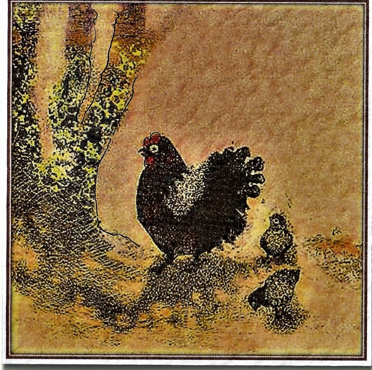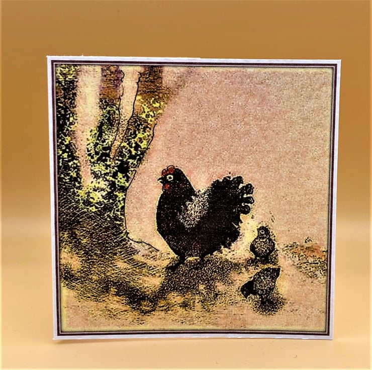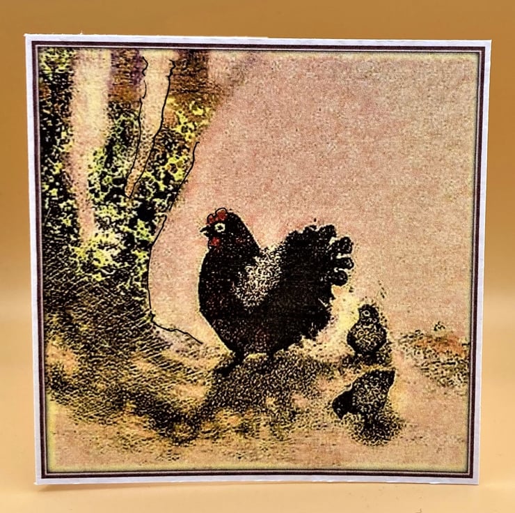 This little card is a charming way to send Mothering Sunday greetings. The card shows mother hen with her chicks enjoying a warm spring day. They are having a lovely time in the dappled shade under the trees. The image is a detail from a larger painting and has been subtly altered, recoloured and given a Lavender Purple border. I also add a tiny touch of outline pen to each card so they are all truly 'handmade' - the one you receive will really be a unique Mothers Day card.