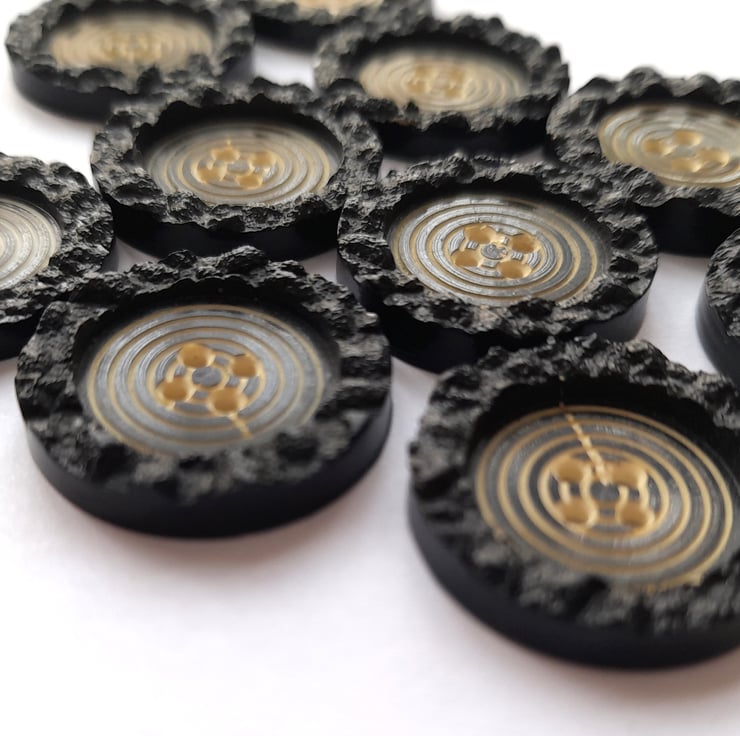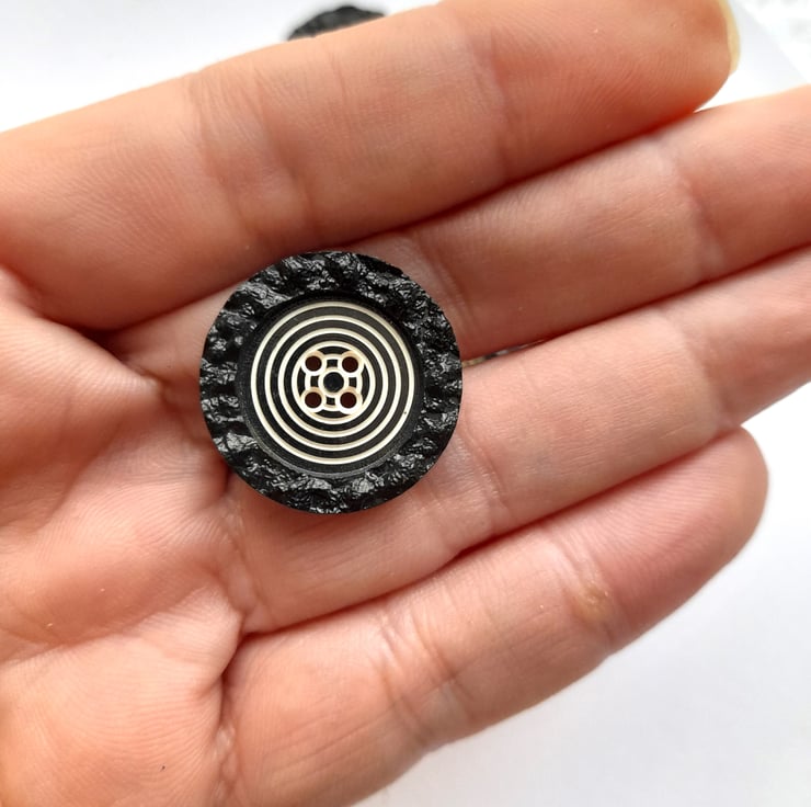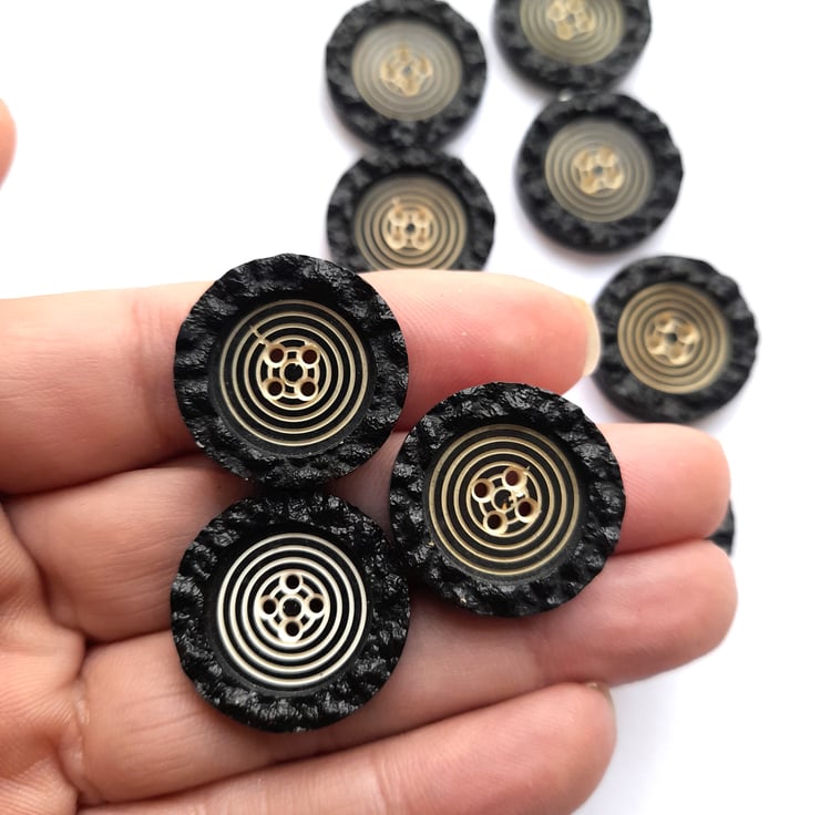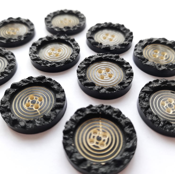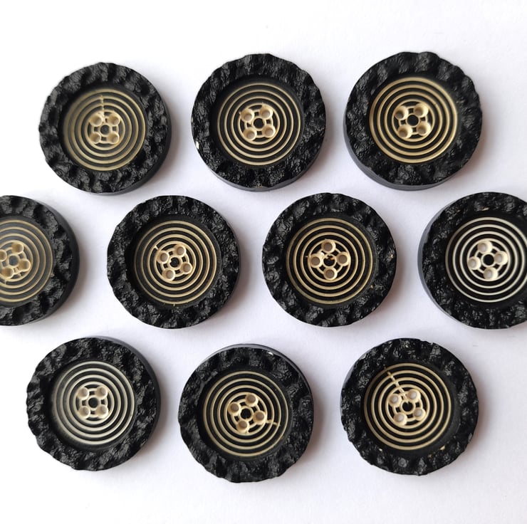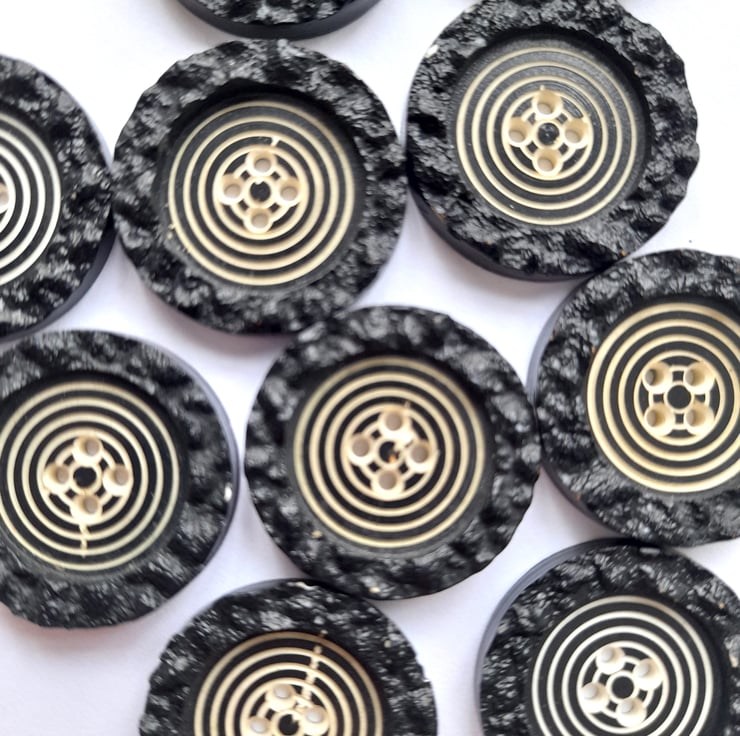 Pack of 10 vintage black flat buttons with a raised textured edge and a decreasing circle design in the middle (which reminds me of a dart board!). 4 holes. 22mm in diameter.