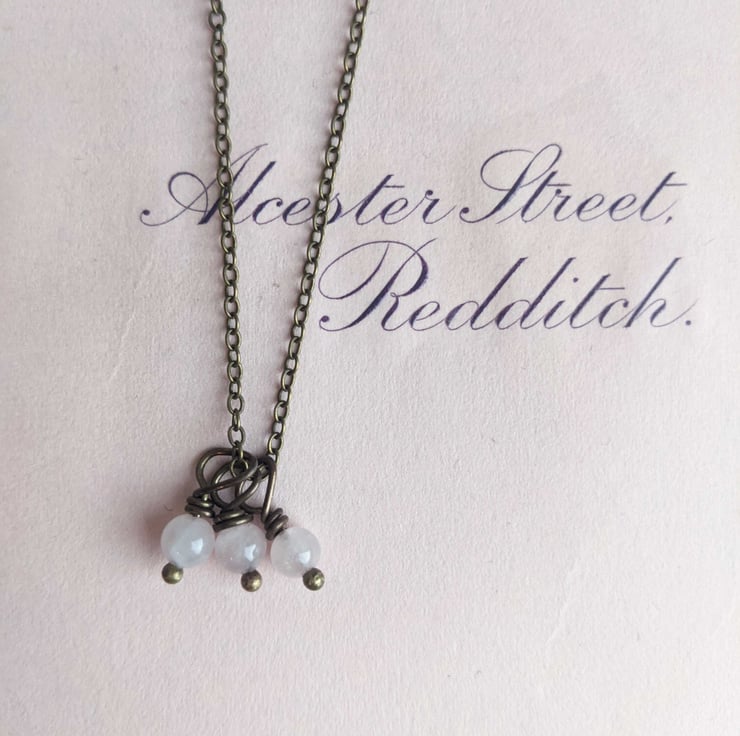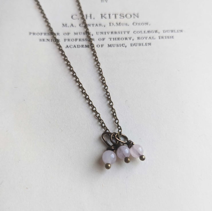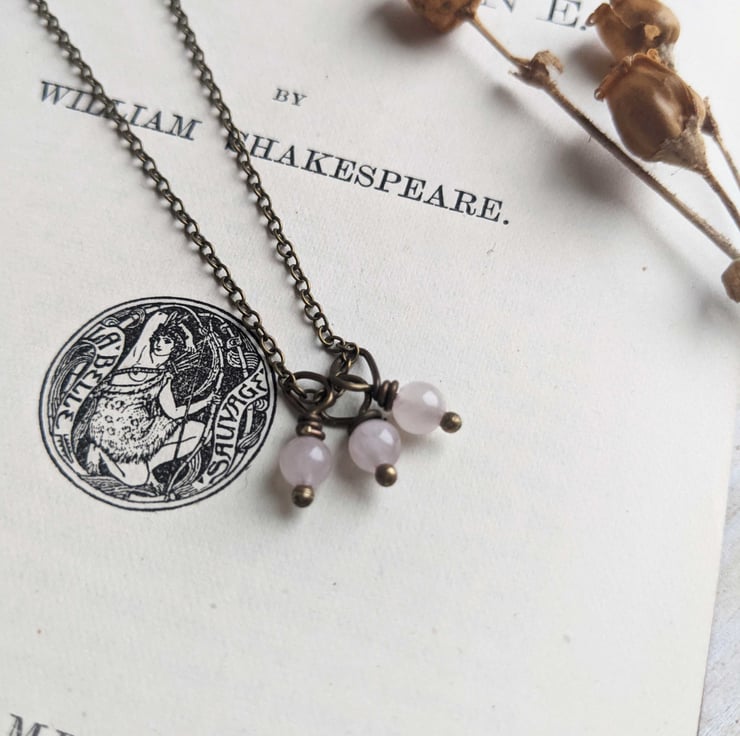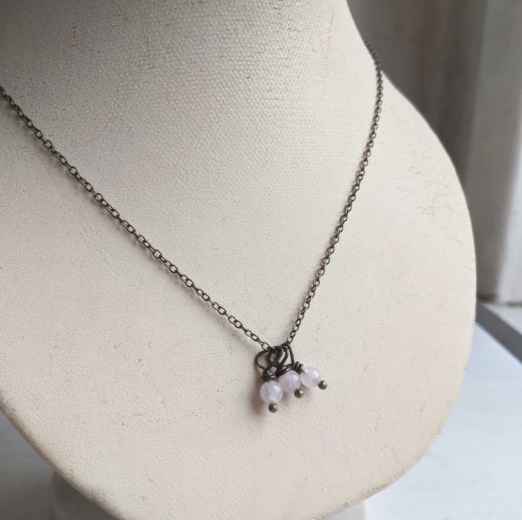 Three beautiful pale pink rose quartz gems in a petite cluster. Hung simply on fine bronze chain.