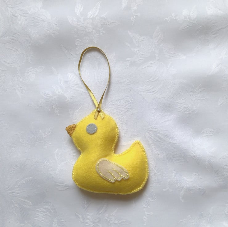 All hand stitched, edged in blanket stitch with yellow embroidery thread. Filled with polyester toy filling. Hanging on a gold coloured ribbon, attached using a small bead.