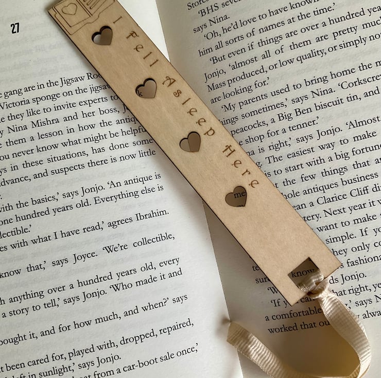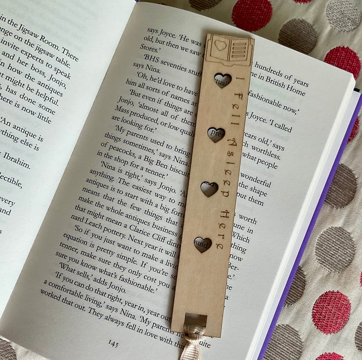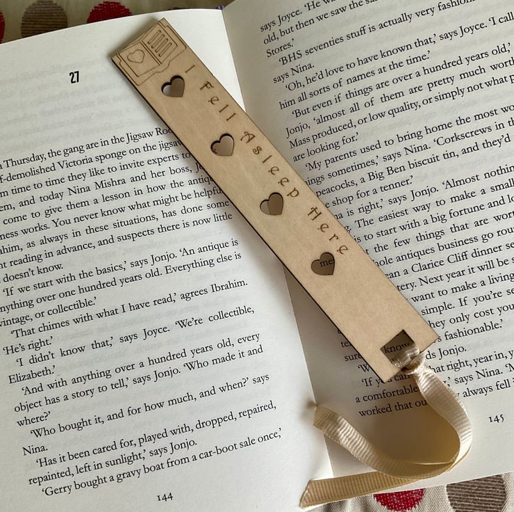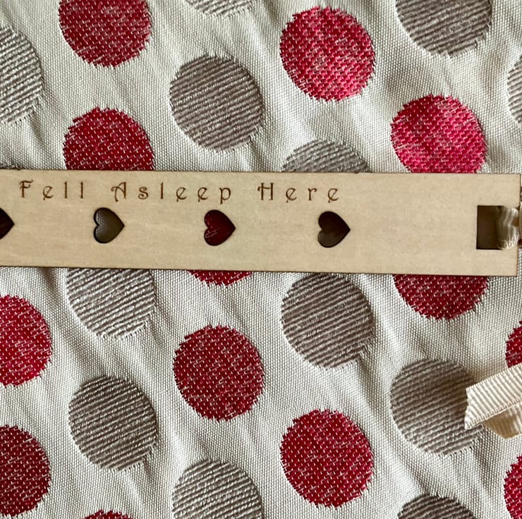 This bookmark has been laser cut with four hearts and etched with a book featuring a heart on the cover at the top and finished with the words ‘I fell asleep here’.