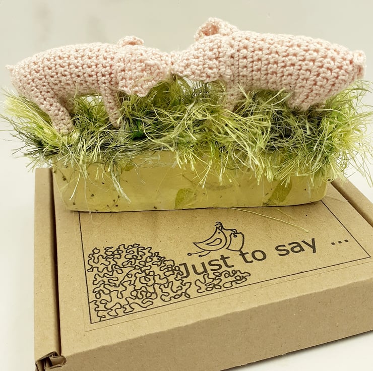 Two little piggies, snout to snout in the grass would make a novel keepsake alternative to a greetings card. The base is made from air dry clay which has been stamped with the words Hogs 'n' Kisses. The clay base is covered in tissue paper containing tamarind leaves and seeds and the top is covered in crocheted eyelash yarn grass. The words are picked out in waterproof ink pen. The pigs are crocheted in cotton and filled with polyester stuffing. They are fixed in place withglue and floristrywire. The whole decoration measures approximately 10.5cm wide and 8 cm tall. It comes wrapped in tissue in a labelled PIP ( Postage in Proportion) box all ready to be given or posted on.