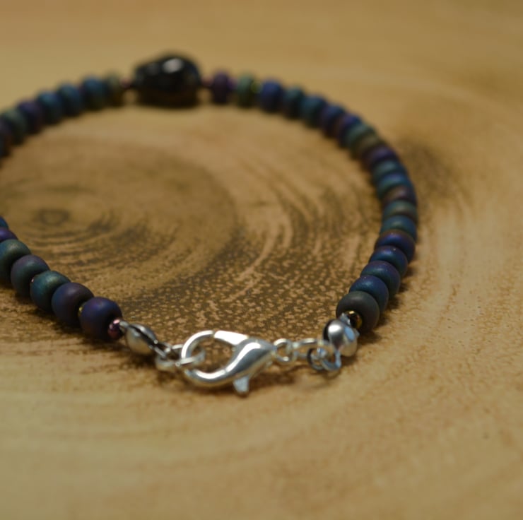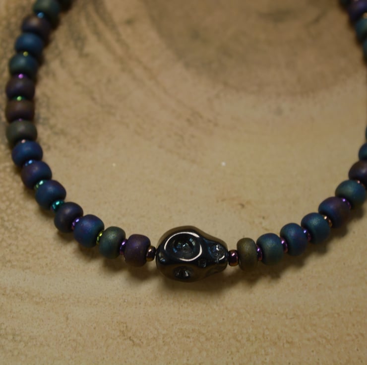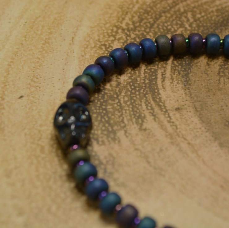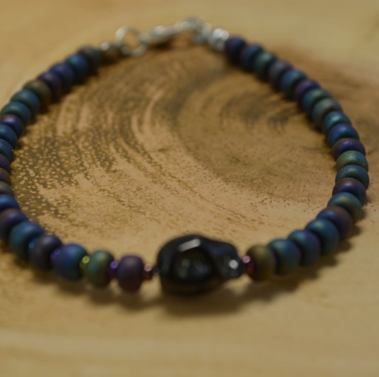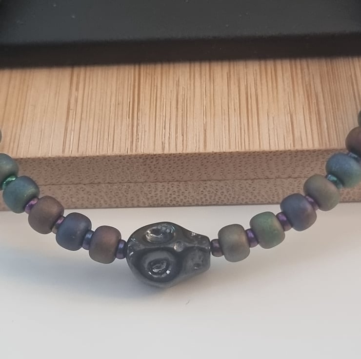 Large matt metallic glass seed beads with small matt metallic glass seed beads in between with a black metallic glass skull in the centre of the bracelet.