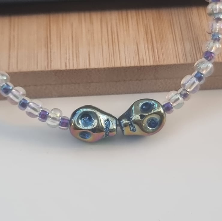 The bracelet is made from large glass clear crystal AB seed beads with small metallic blue glass seed beads in between each of the large seed beads and two metallic blue glass skull beads in the center of the bracelet. The beads are on a metal beading wire and the bracelet fastens with a silver clasp. As the bracelet is handmade I can make the bracelet a different size however a change in cost may apply, please contact me directly to discuss.