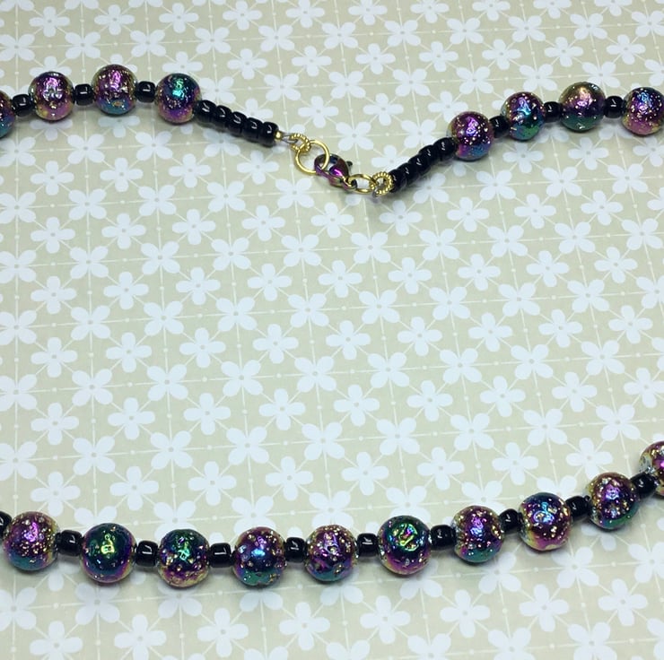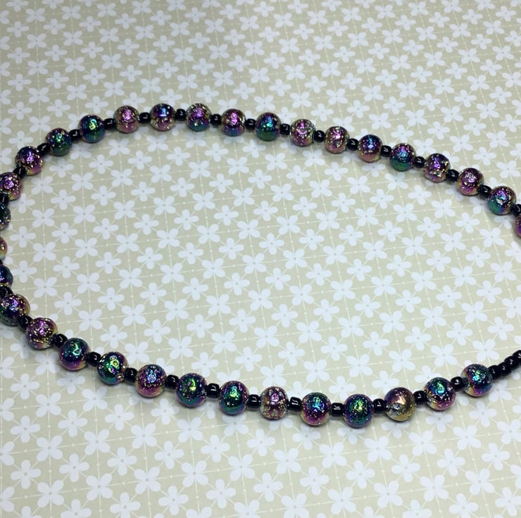 These 8mm round Lava Rock Gems have been Electroplated with an Aurora Borealis coating giving them a unique iridescent shimmer when each bead catches the light. In between each bead is a smaller black glass spacer bead.