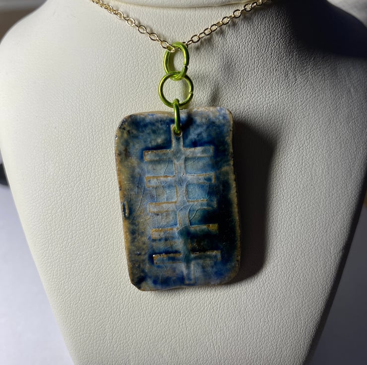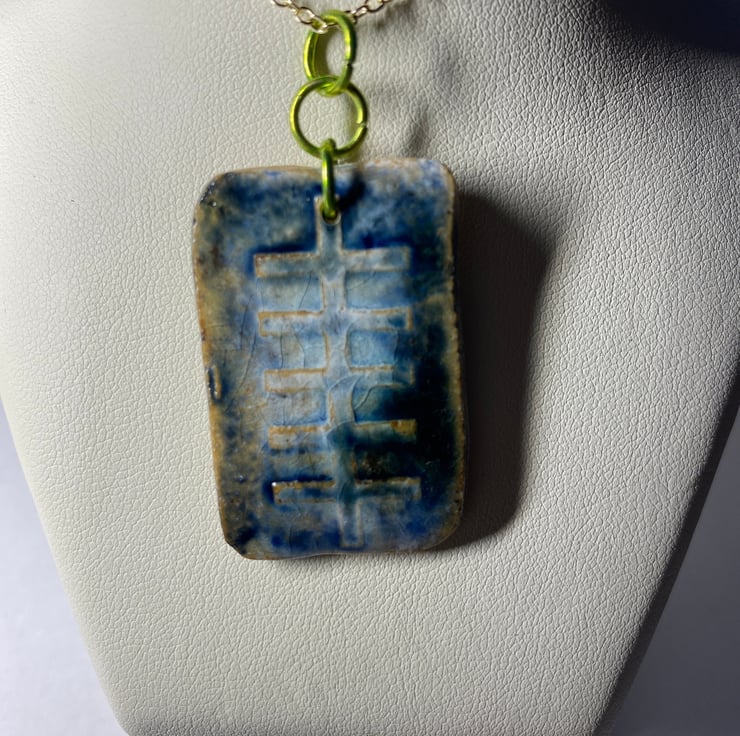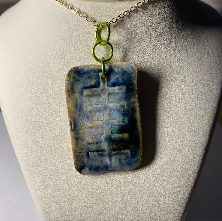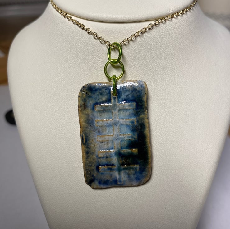Every Ogham rune pendant I make is different and never repeated. This iodhadh measures 3.5 cm tall, 2.3cm wide and approx 2mm deep. It's made from clay (ceramic) and fired to stoneware. The pendant is fitted with 3 rings and comes with a choice of necklace material and necklace length. This particular rune pendant has a rustic finish and has blue and green tones.