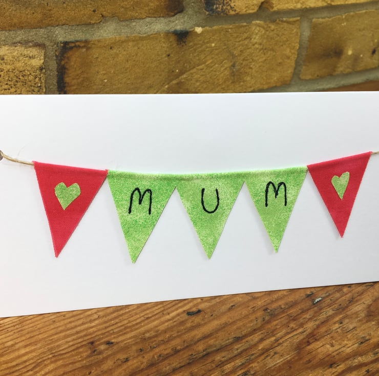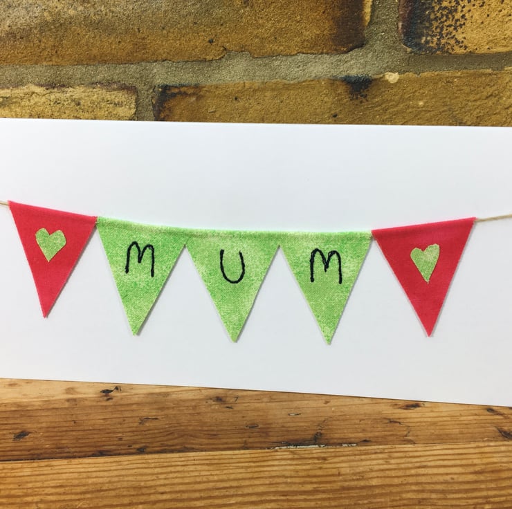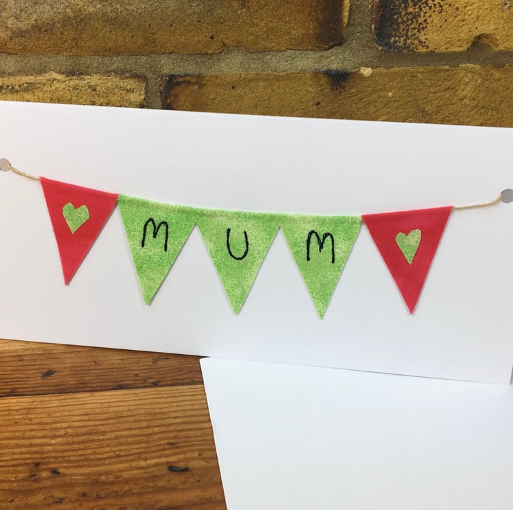 Make your Mum’s birthday or Mother's Day extra special with this delightful handmade card adorned with mini bunting flags. What sets this card apart is the thoughtful embroidery on three of the flags, spelling out the sweet sentiment "Mum” and pretty hearts on the other two flags.