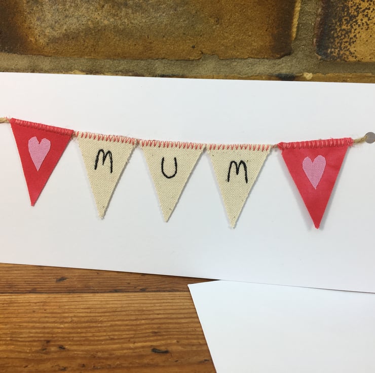 Three flags are personalised with embroidery spelling out "Mum” and the two other flags are embellished with pretty hearts. A very special and unique handmade card combining natural calico linen and pink cotton fabric.