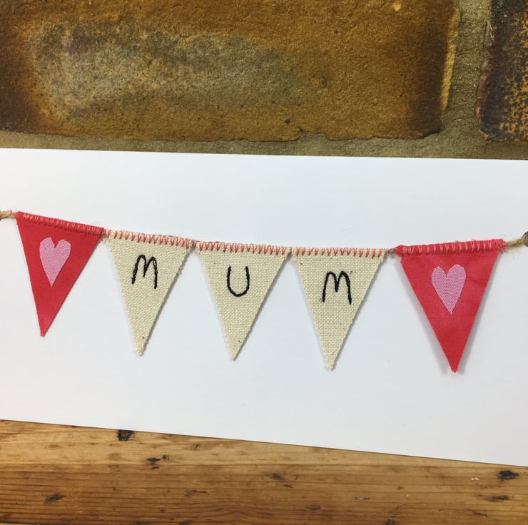 Three flags are personalised with embroidery spelling out "Mum” and the two other flags are embellished with pretty hearts. A very special and unique handmade card combining natural calico linen and pink cotton fabric.