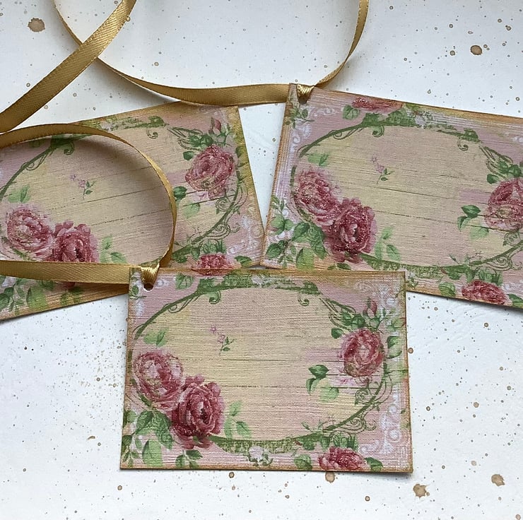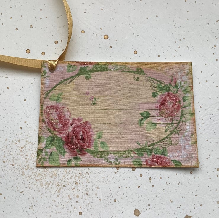 Lovely vintage Rose images on bookplate-style background .I have printed on to high quality linen-look (285gsm) card . Of course there has to some shimmer! and so I have added the very necessary glitter to the blooms . Tied with elegant ,silky ,vintage -style ribbon !!