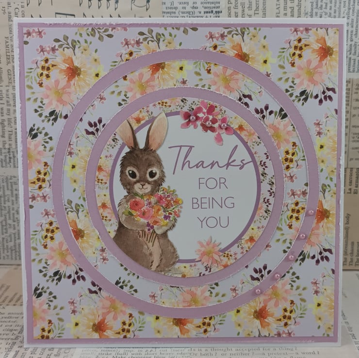 Square thank you card in a tent folded style. The card features a printed topper with a cute rabbit holding flowers, along with the sentiment 'Thanks for being you'. The circular image has been mounted onto pale lilac card and overlaid onto a floral background, within a larger lilac card circle. The larger circle and the flowers at the top of the topper have been embellished with small lilac gems.