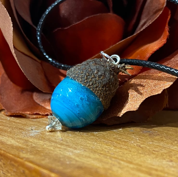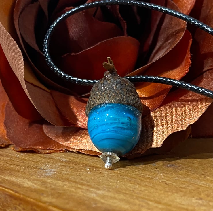This beautiful pendant was created in glass, using the craft of lamp work. This is then paired with a real acorn cup, to create a beautiful and unique pendant. Created with bubbles on the glass to create a delicate sparkle appearance. The pendant will come in a gift box on a simple waxed cord.