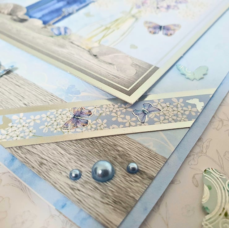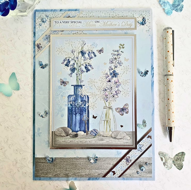 The card consists of mats & layers of blue patterned paper & floral patterned cardstock, on a white card base. It is decorated with coordinating silver foiled toppers & the sentiment "To A Very Special Mum On Mother's Day". It is embellished with matching craft pearls, glitter drops and dimensional butterfly elements! The card displays the image of two vases filled with bluebells and other spring flowers. It is finished with a matching double insert, that has been left blank, for you to add your messages and wishes. It measures approx.15x21cm (A5).
