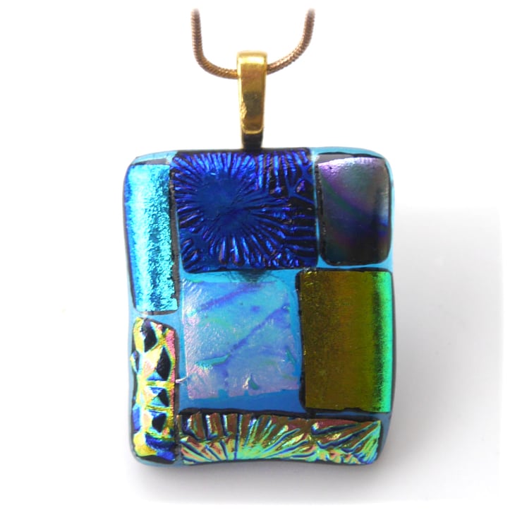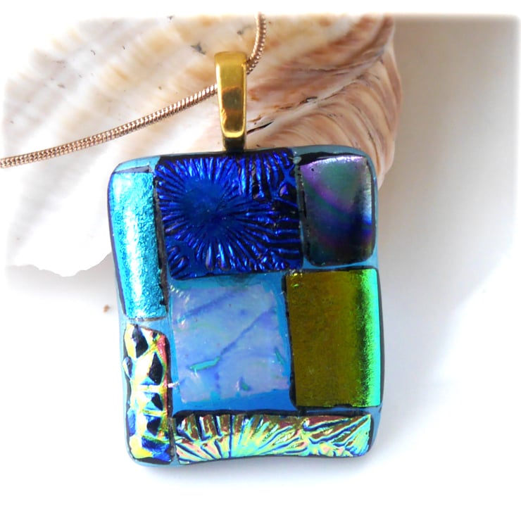 Dichroic glass has to be the most perfect glass for a glass addict like myself as it has a wonderful shimmer and positively magical colour changing properties.. And when you add patchwork to the equation.. well it is just magic.Please note that these pieces are one-offs and unrepeatable. I can make similar but unless I make them together I cannot exactly match something already made.