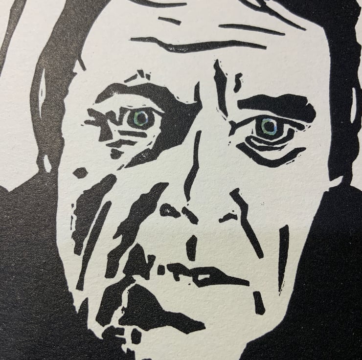 A lino print of Richard Burton in the film, The Medusa Touch. It is A5 in size, and is printed on ivory-white 80gsm Japanese Simili paper using non-toxic ink. His eyes are coloured with coloured pencils.