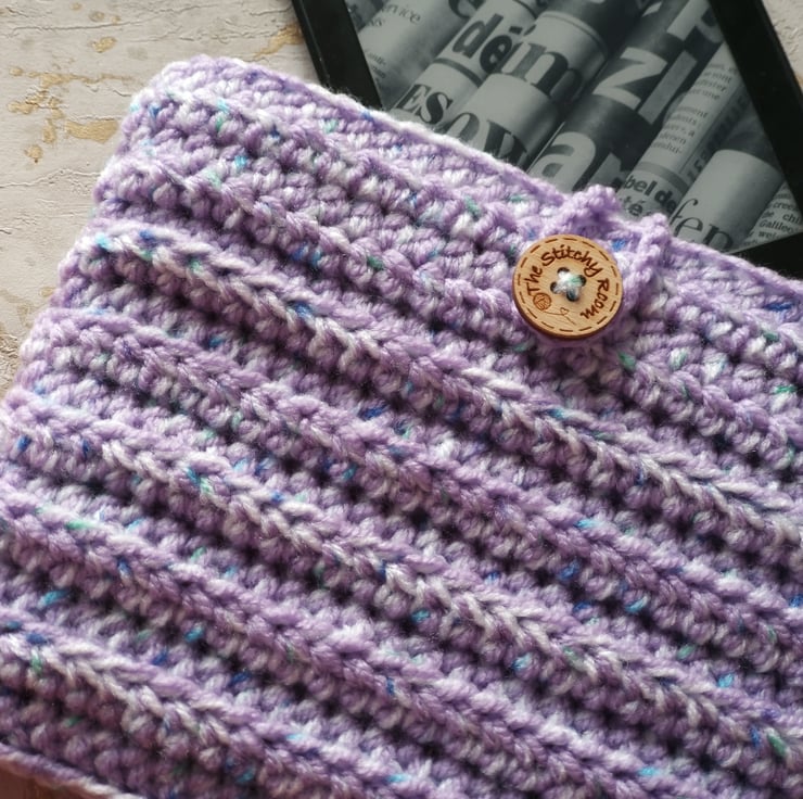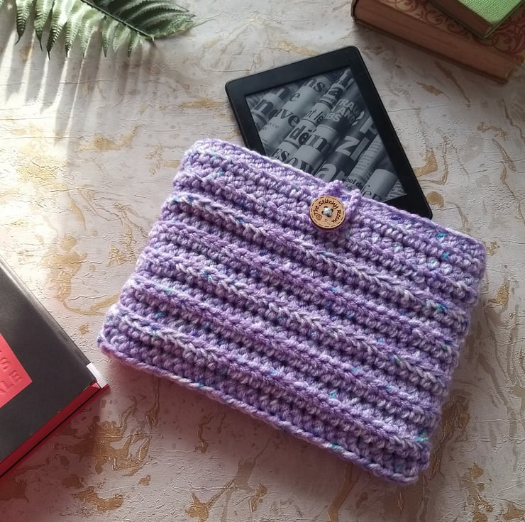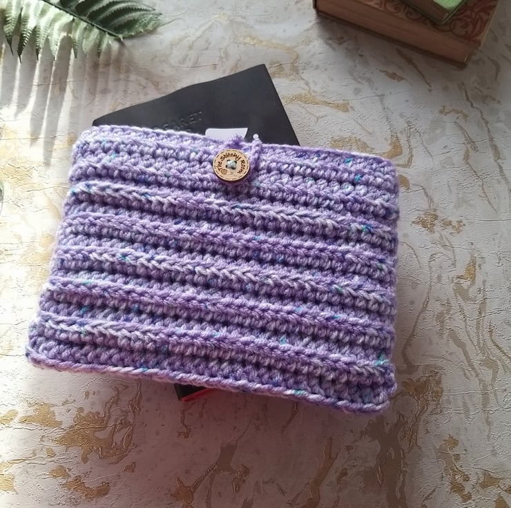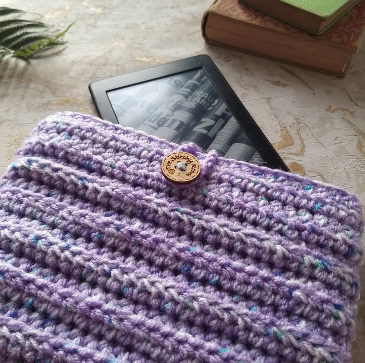 I've used two strands of yarn together in a gentle lavender and an off white with little flecks of turquoise, blues and greens to give a pretty pattern. Finished off with a loop and button fastening so your kindle or book doesn't fall out.