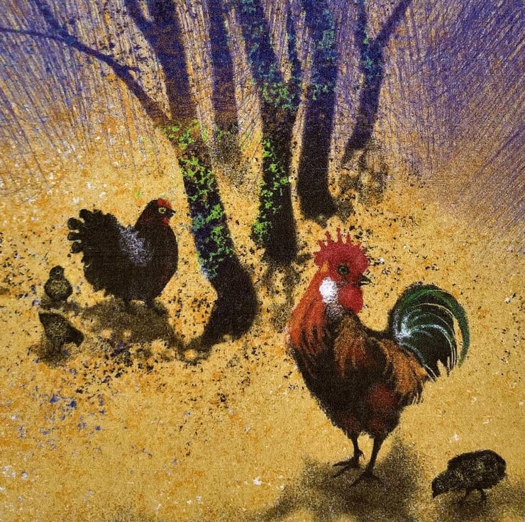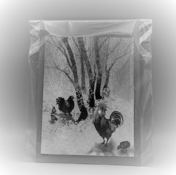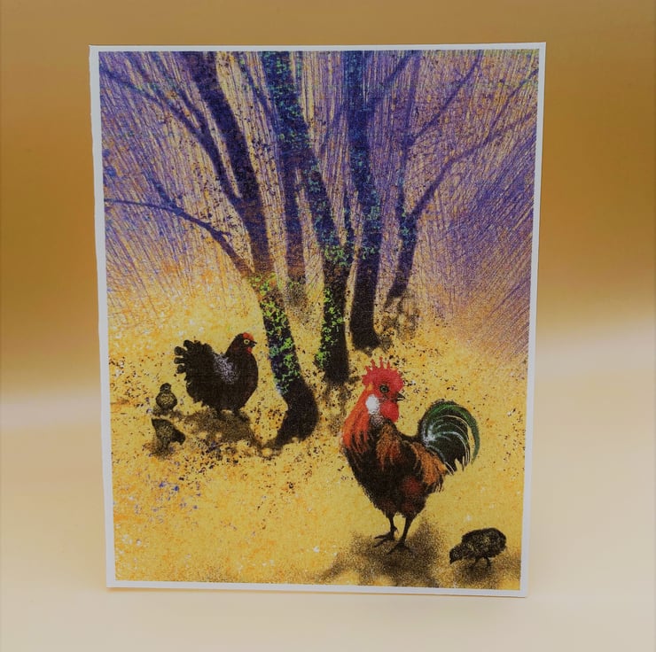 This little card is a charming way to send Mothering Sunday greetings. The card shows mother hen with her chicks enjoying a warm spring day all under dads watchful eye. They are having a lovely time in the dappled shade under the trees, a real free range chicken family. The print is taken from an original digital painting I did. This one is the violet mauve version.
