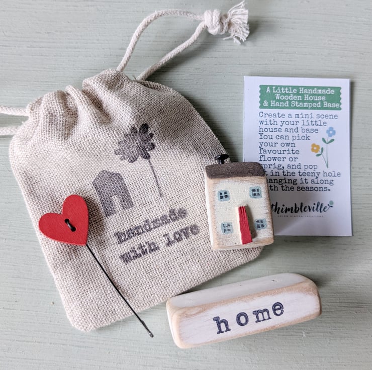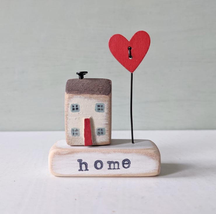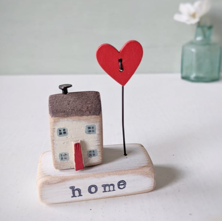 A hand stamped wooden base with a teeny painted house and a jolly heart on a wire to stand beside it.