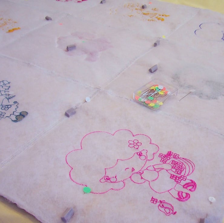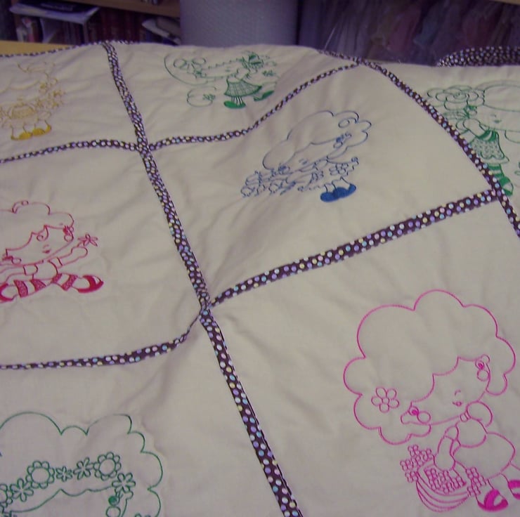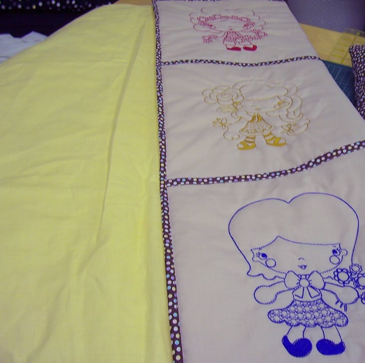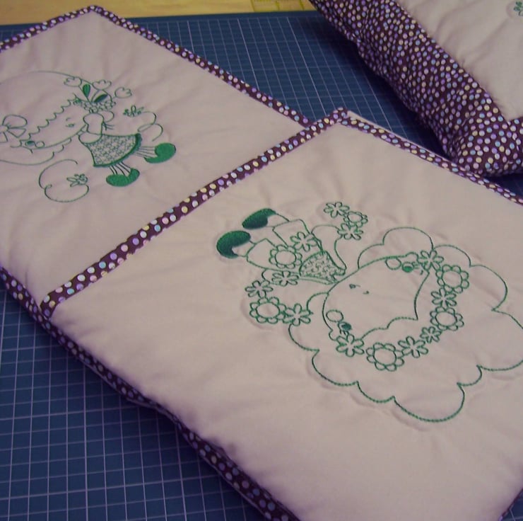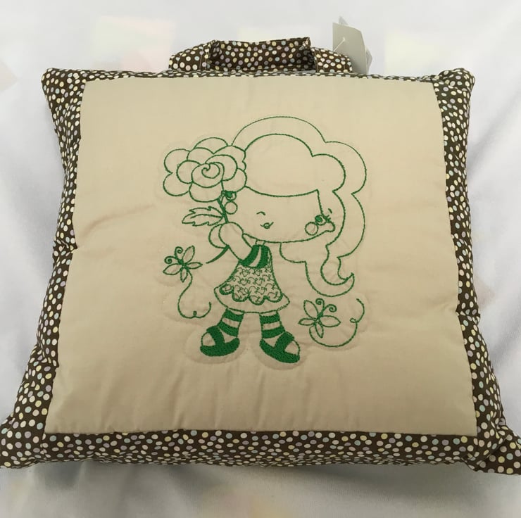 Using a set of 9 embroidered and quilted blocks, I made my version of a quillow, but instead of being either a quilt OR a pillow as they are, I made a separate quilt AND a pillow. This size would be for a toddler as it measures 27” square. ( 69 cms )