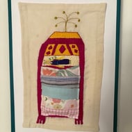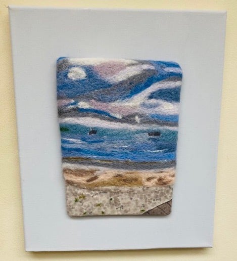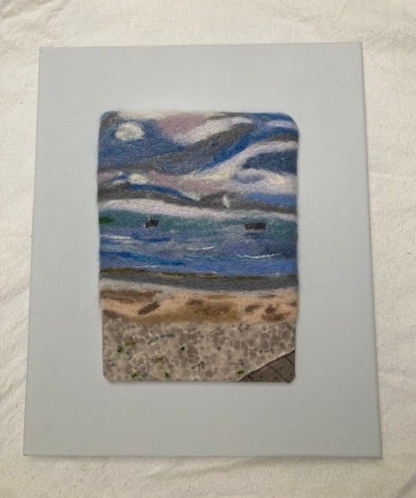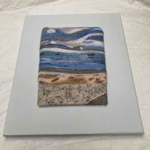 This charming depiction of the beach leading out to the wild winter sea and skies has been created with the needle felting process. The cobbled beach & boats in the far distance are made with artist pro marker pens to give a different texture. The actual picture measures 19cm x 14 cm & has been wrapped round some foam board, which has then been mounted onto a light grey painted canvas to give a final picture size of 25cm x 30 cm. The picture is ready to hang.