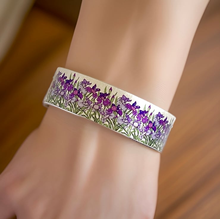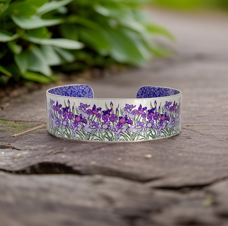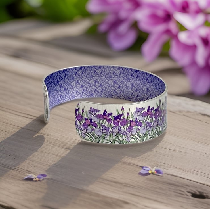 Handmade cuff bracelet with iris flowers, which has a purple and violet hand drawn design against a brushed silver background. The back has a purple pattern. Matching pendant and earrings are available. An inscription can be added to the reverse for a small extra charge. (Optional)