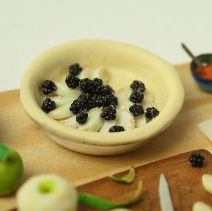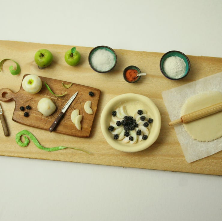 Hand made 12 scale doll house miniatures for a complete apple and blackberry pie making scene, ready to place within your dollhouse in whatever arrangement you prefer, as they are not glued down to a board.