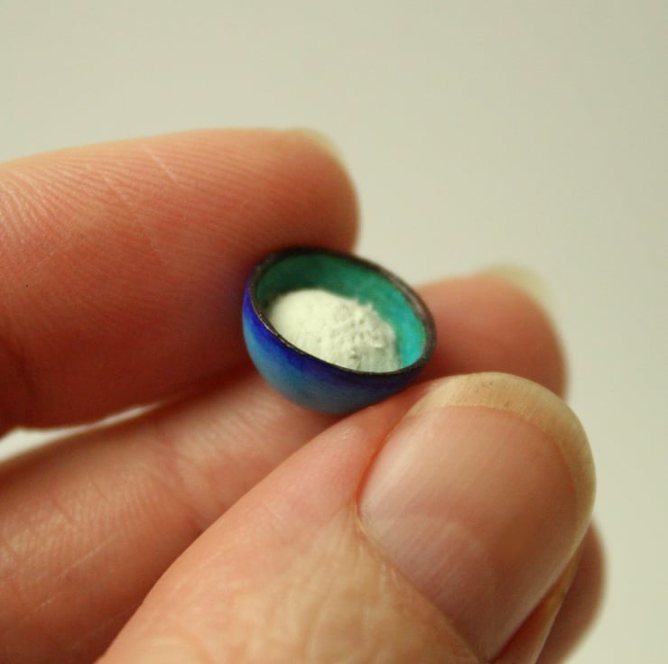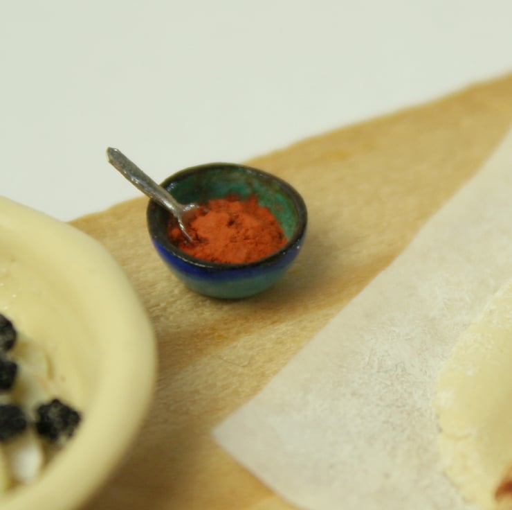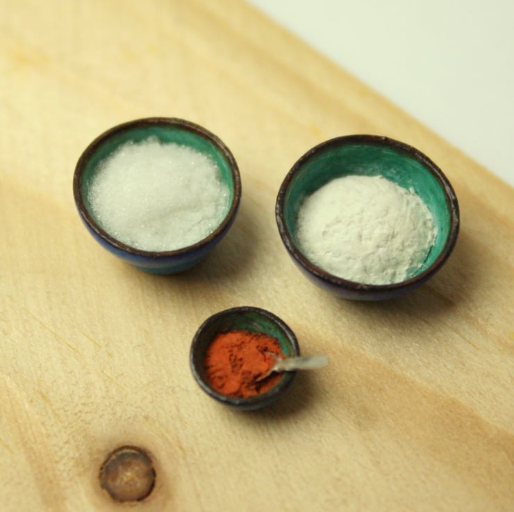 3 hand made and painted polymer clay bowls containing solid fake sugar, flour and cinnamon.